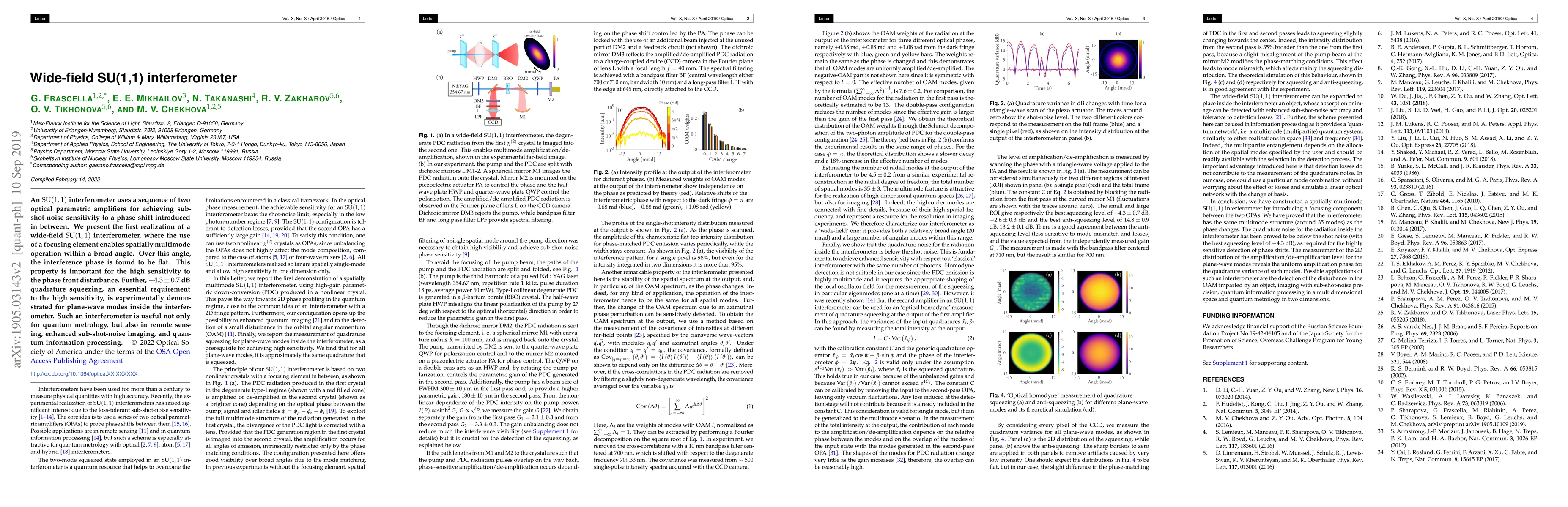 The paper presents the first wide-field SU(1,1) interferometer utilizing optical parametric amplifiers for sub-shot-noise sensitivity, demonstrating flat interference phase over a broad angle and achieving -4.3±0.7 dB quadrature squeezing, which is crucial for its applications in quantum metrology, remote sensing, and quantum information processing.