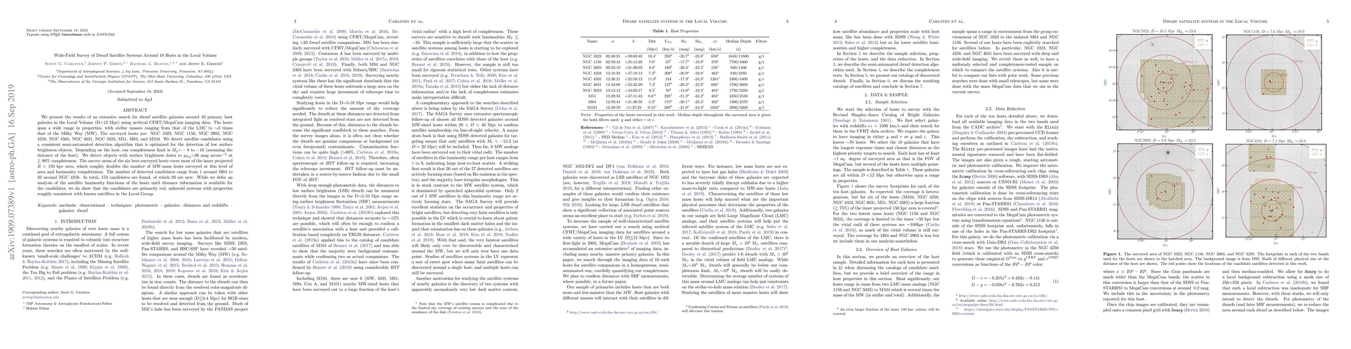 We present the results of an extensive search for dwarf satellite galaxies around 10 primary host galaxies in the Local Volume (D$<$12 Mpc) using archival CFHT/MegaCam imaging data. The hosts span a wide range in properties, with stellar masses ranging from that of the LMC to ${\sim}3$ times that of the Milky Way (MW). The surveyed hosts are: NGC 1023, NGC 1156, NGC 2903, NGC 4258, NGC 4565, NGC 4631, NGC 5023, M51, M64, and M104. We detect satellite candidates using a consistent semi-automated detection algorithm that is optimized for the detection of low surface brightness objects. Depending on the host, our completeness limit is $M_g{\sim}-8$ to $-10$ (assuming the distance of the host). We detect objects with surface brightness down to $\mu_{0,g}{\sim}26$ mag arcsec$^{-2}$ at $\gtrsim90\%$ completeness. The survey areas of the six best-surveyed hosts cover most of the inner projected $R<150$ kpc area, which roughly doubles the number of MW-mass hosts surveyed at this level of area and luminosity completeness. The number of detected candidates range from 1 around M64 to 33 around NGC 4258. In total, 153 candidates are found, of which 93 are new. While we defer an analysis of the satellite luminosity functions of the hosts until distance information is available for the candidates, we do show that the candidates are primarily red, spheroid systems with properties roughly consistent with known satellites in the Local Group.