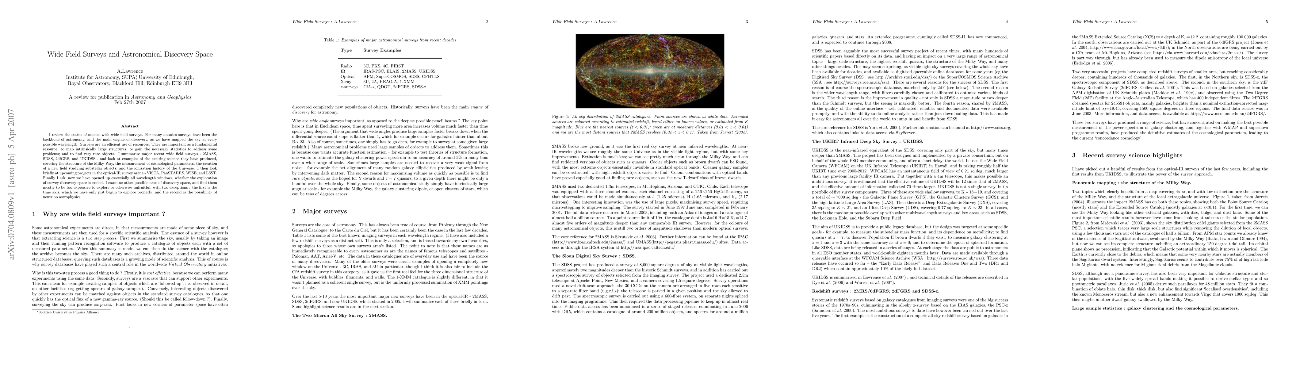 This paper reviews the role of wide field surveys in advancing astronomical discovery, highlighting major surveys like 2MASS, SDSS, and LSST, and their contributions to understanding the Milky Way, cosmology, and substellar objects. It also explores future prospects, noting that while most avenues are costly, the time axis and neutrino astrophysics offer promising new frontiers.