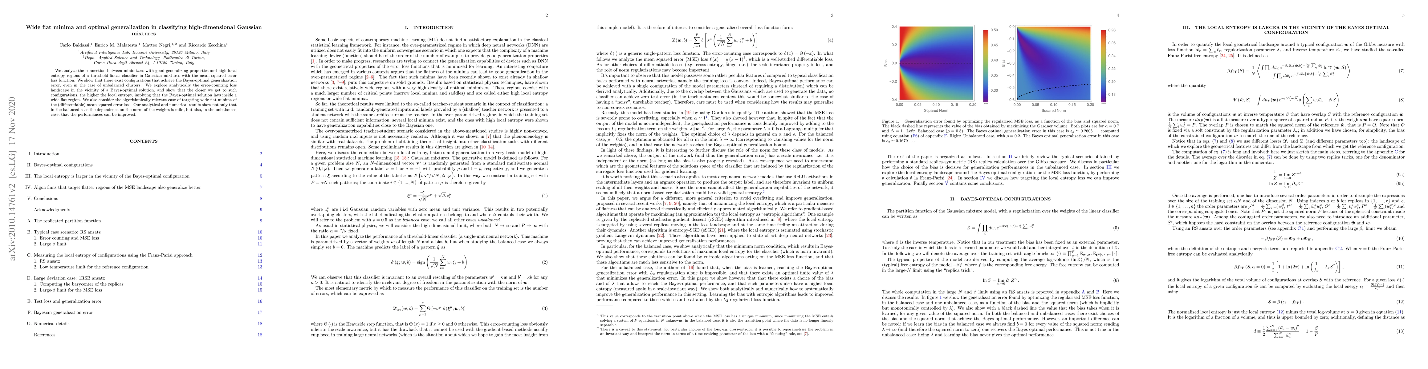 This paper investigates the relationship between wide flat minima in the loss landscape of threshold-linear classifiers and optimal generalization in high-dimensional Gaussian mixtures. It demonstrates that configurations with high local entropy near Bayes-optimal solutions lead to optimal generalization, even in unbalanced clusters.