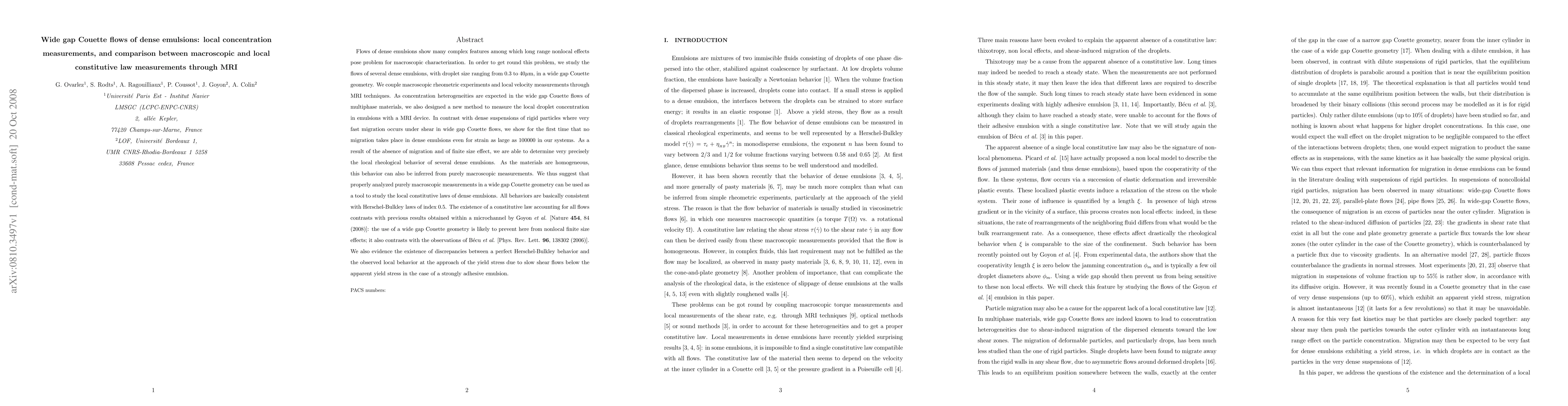 This paper investigates the rheological behavior of dense emulsions in wide-gap Couette flows, employing MRI for local concentration measurements and comparing macroscopic and local constitutive laws. The study reveals no droplet migration in dense emulsions, allowing precise local rheological determination and suggesting that macroscopic measurements in this geometry can effectively study local constitutive laws.