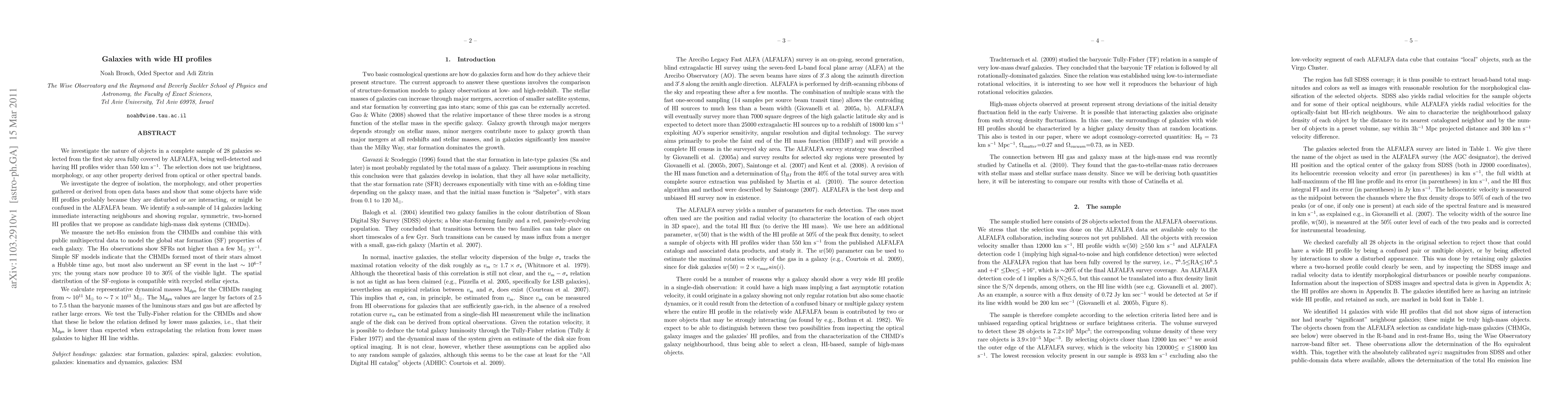 We investigate the nature of objects in a complete sample of 28 galaxies selected from the first sky area fully covered by ALFALFA, being well-detected and having HI profiles wider than 550 km/s. The selection does not use brightness, morphology, or any other property derived from optical or other spectral bands. We investigate the degree of isolation, the morphology, and other properties gathered or derived from open data bases and show that some objects have wide HI profiles probably because they are disturbed or are interacting, or might be confused in the ALFALFA beam. We identify a sub-sample of 14 galaxies lacking immediate interacting neighbours and showing regular, symmetric, two-horned HI profiles that we propose as candidate high-mass disk systems (CHMDs). We measure the net-Halpha emission from the CHMDs and combine this with public multispectral data to model the global star formation (SF) properties of each galaxy. The Halpha observations show SFRs not higher than a few solar masses per year. Simple SF models indicate that the CHMDs formed most of their stars almost a Hubble time ago, but most also underwent an SF event in the last 1-10 Myrs; the young stars now produce 10 to 30% of the visible light. The spatial distribution of the SF-regions is compatible with recycled stellar ejecta. We calculate representative dynamical masses from 1 to $\sim7 10^{11}$ M_sun, larger by factors of 2.5 to 7.5 than the baryonic masses of the luminous stars and gas. We test the Tully-Fisher relation for the CHMDs and show that these lie below the relation defined for lower mass galaxies, i.e., that their M_dyn is lower than expected when extrapolating the relation from lower mass galaxies to higher HI line widths.