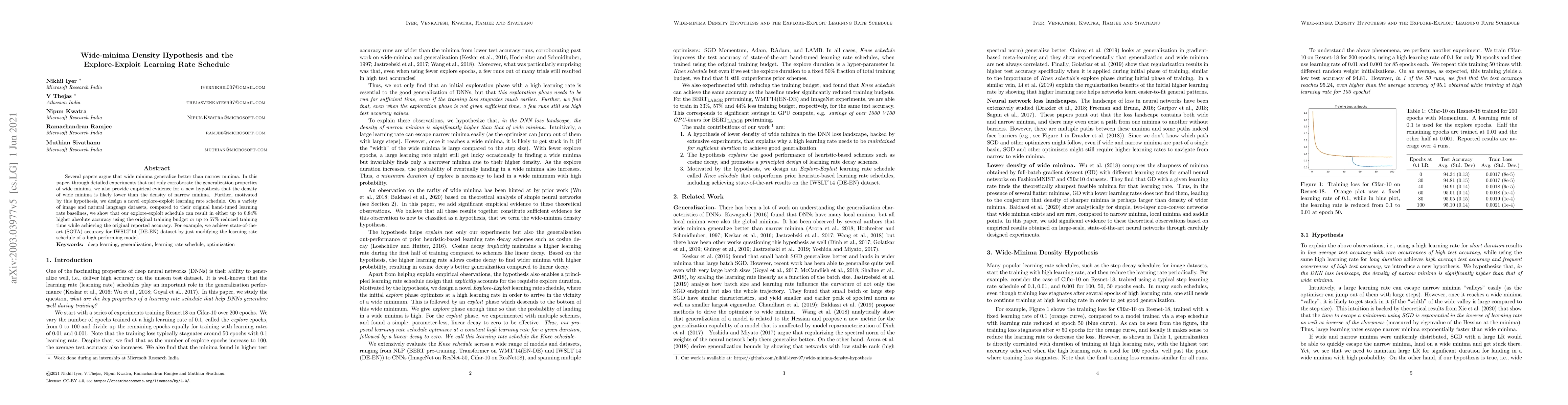 This paper confirms that wide minima generalize better and hypothesizes that their density is lower than narrow minima. It introduces an explore-exploit learning rate schedule that achieves up to 0.84% higher accuracy or up to 57% reduced training time on various datasets, demonstrating state-of-the-art performance on the IWSLT'14 dataset.