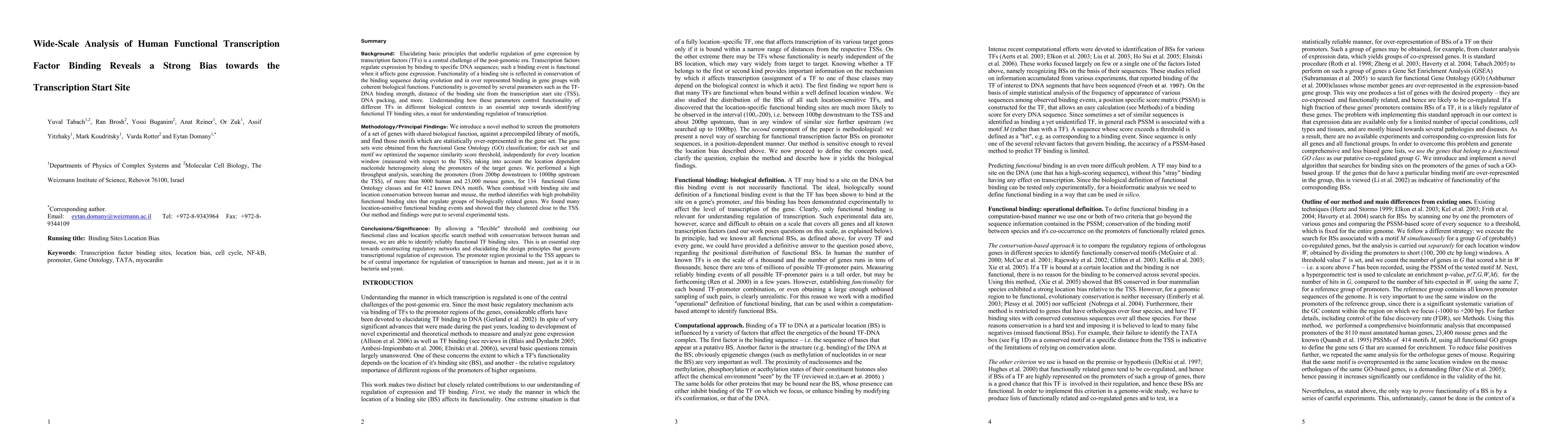 We introduce a novel method to screen the promoters of a set of genes with shared biological function, against a precompiled library of motifs, and find those motifs which are statistically over-represented in the gene set. The gene sets were obtained from the functional Gene Ontology (GO) classification; for each set and motif we optimized the sequence similarity score threshold, independently for every location window (measured with respect to the TSS), taking into account the location dependent nucleotide heterogeneity along the promoters of the target genes. We performed a high throughput analysis, searching the promoters (from 200bp downstream to 1000bp upstream the TSS), of more than 8000 human and 23,000 mouse genes, for 134 functional Gene Ontology classes and for 412 known DNA motifs. When combined with binding site and location conservation between human and mouse, the method identifies with high probability functional binding sites that regulate groups of biologically related genes. We found many location-sensitive functional binding events and showed that they clustered close to the TSS. Our method and findings were put to several experimental tests. By allowing a "flexible" threshold and combining our functional class and location specific search method with conservation between human and mouse, we are able to identify reliably functional TF binding sites. This is an essential step towards constructing regulatory networks and elucidating the design principles that govern transcriptional regulation of expression. The promoter region proximal to the TSS appears to be of central importance for regulation of transcription in human and mouse, just as it is in bacteria and yeast.