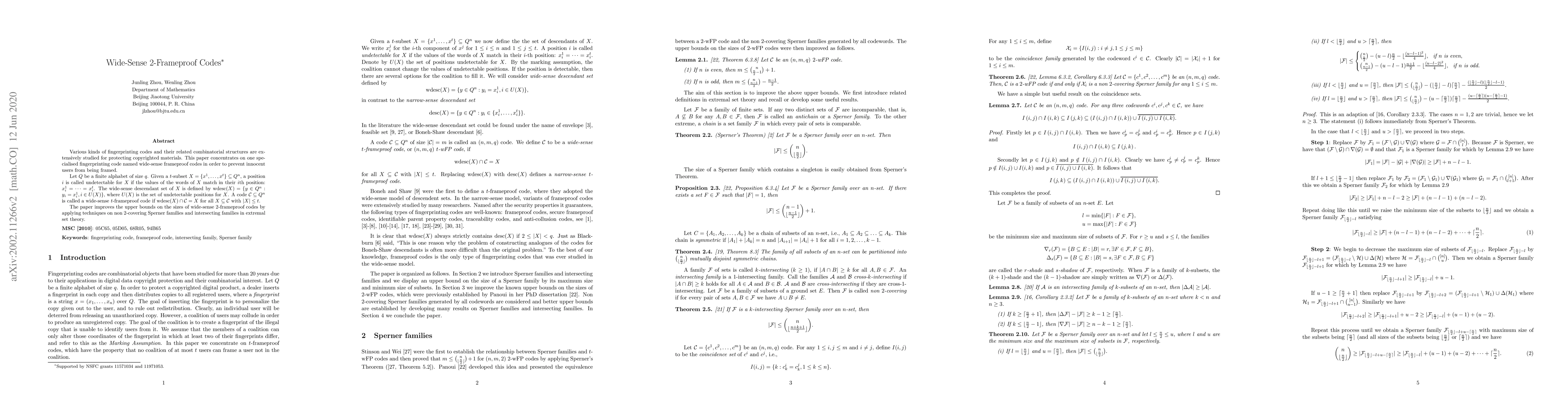 This paper studies wide-sense 2-frameproof codes, a specialized fingerprinting code designed to protect copyrighted materials by preventing innocent users from being falsely implicated. It improves upper bounds on the sizes of these codes using techniques from non 2-covering Sperner families and intersecting families in extremal set theory.