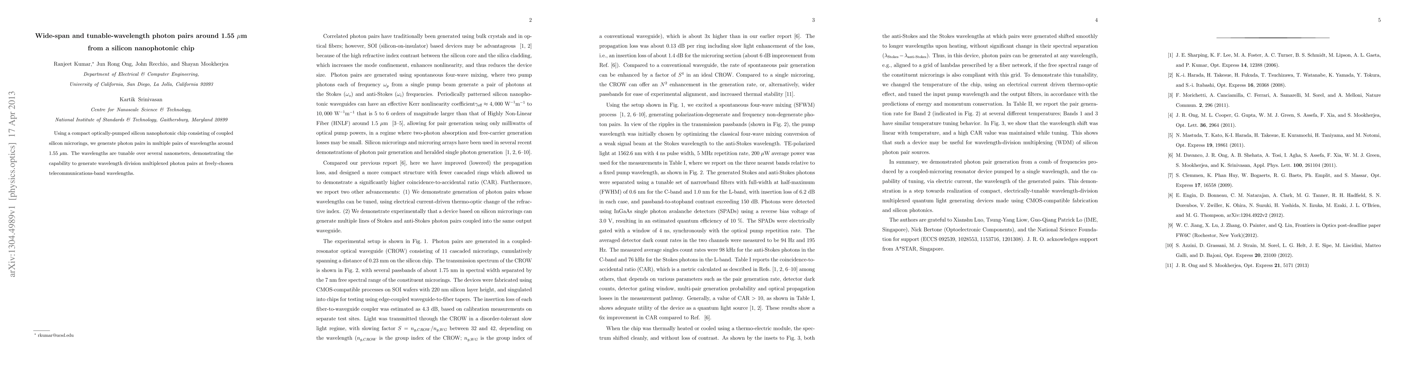 This research demonstrates a compact silicon nanophotonic chip generating tunable photon pairs around 1.55 μm using coupled silicon microrings, enabling wavelength division multiplexing for telecommunications. The generated photon pairs exhibit wide-span and tunable wavelengths over several nanometers.