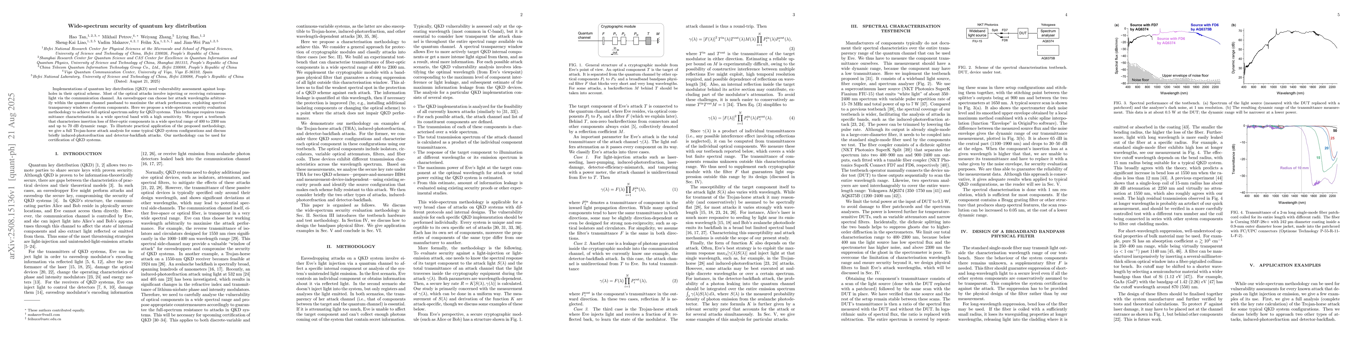 Implementations of quantum key distribution (QKD) need vulnerability assessment against loopholes in their optical scheme. Most of the optical attacks involve injecting or receiving extraneous light via the communication channel. An eavesdropper can choose her attack wavelengths arbitrarily within the quantum channel passband to maximise the attack performance, exploiting spectral transparency windows of system components. Here we propose a wide-spectrum security evaluation methodology to achieve full optical spectrum safety for QKD systems. This technique requires transmittance characterisation in a wide spectral band with a high sensitivity. We report a testbench that characterises insertion loss of fiber-optic components in a wide spectral range of 400 to 2300 nm and up to 70 dB dynamic range. To illustrate practical application of the proposed methodology, we give a full Trojan-horse attack analysis for some typical QKD system configurations and discuss briefly induced-photorefraction and detector-backflash attacks. Our methodology can be used for certification of QKD systems.