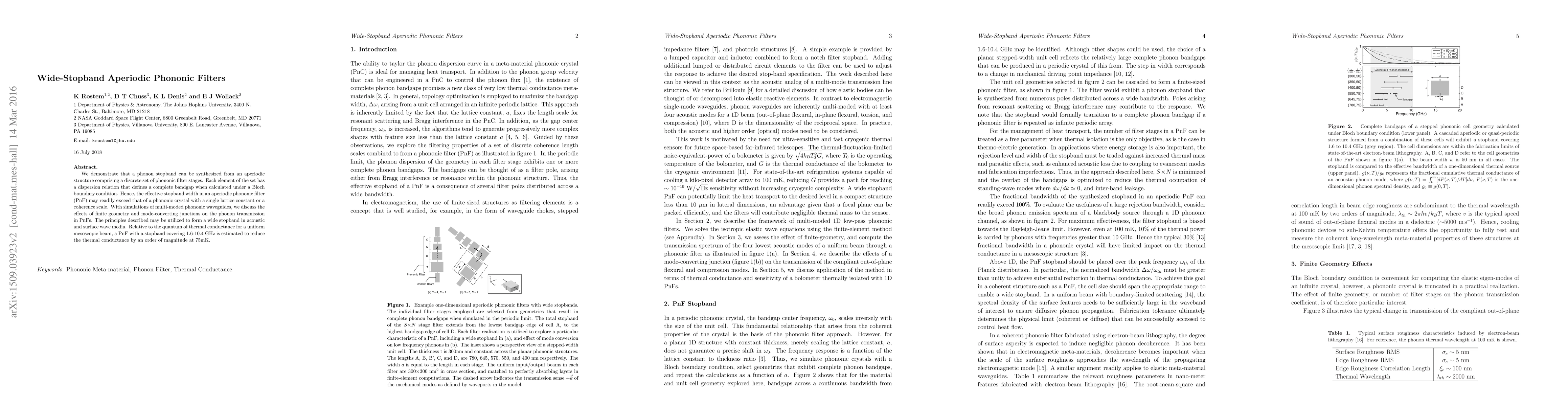 This paper demonstrates the creation of a wide-stopband phononic filter using an aperiodic structure, showing that its effective stopband width can surpass that of traditional phononic crystals. The study also explores the impact of finite geometry and mode-converting junctions on phonon transmission, suggesting potential applications in reducing thermal conductance in acoustic and surface wave media.
