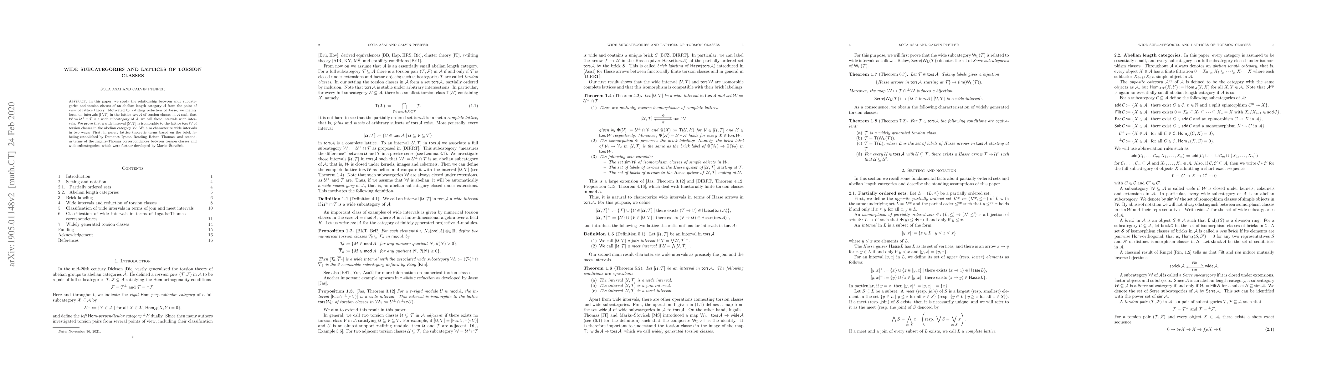 In this paper, we study the relationship between wide subcategories and torsion classes of an abelian length category $\mathcal{A}$ from the point of view of lattice theory. Motivated by $\tau$-tilting reduction of Jasso, we mainly focus on intervals $[\mathcal{U},\mathcal{T}]$ in the lattice $\operatorname{\mathsf{tors}} \mathcal{A}$ of torsion classes in $\mathcal{A}$ such that $\mathcal{W}:=\mathcal{U}^\perp \cap \mathcal{T}$ is a wide subcategory of $\mathcal{A}$; we call these intervals wide intervals. We prove that a wide interval $[\mathcal{U},\mathcal{T}]$ is isomorphic to the lattice $\operatorname{\mathsf{tors}} \mathcal{W}$ of torsion classes in the abelian category $\mathcal{W}$. We also characterize wide intervals in two ways: First, in purely lattice theoretic terms based on the brick labeling established by Demonet--Iyama--Reading--Reiten--Thomas; and second, in terms of the Ingalls--Thomas correspondences between torsion classes and wide subcategories, which were further developed by Marks--\v{S}\v{t}ov\'{i}\v{c}ek.