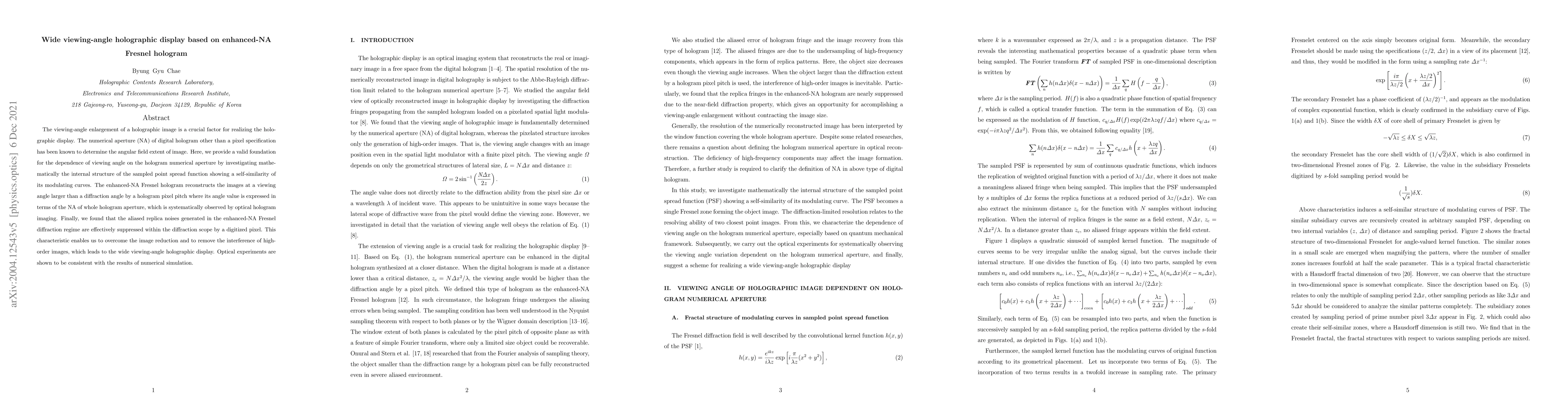The viewing-angle enlargement of a holographic image is a crucial factor for realizing the holographic display. The numerical aperture (NA) of digital hologram other than a pixel specification has been known to determine the angular field extent of image. Here, we provide a valid foundation for the dependence of viewing angle on the hologram numerical aperture by investigating mathematically the internal structure of the sampled point spread function showing a self-similarity of its modulating curves. The enhanced-NA Fresnel hologram reconstructs the images at a viewing angle larger than a diffraction angle by a hologram pixel pitch where its angle value is expressed in terms of the NA of whole hologram aperture, which is systematically observed by optical hologram imaging. Finally, we found that the aliased replica noises generated in the enhanced-NA Fresnel diffraction regime are effectively suppressed within the diffraction scope by a digitized pixel. This characteristic enables us to overcome the image reduction and to remove the interference of high-order images, which leads to the wide viewing-angle holographic display. Optical experiments are shown to be consistent with the results of numerical simulation.