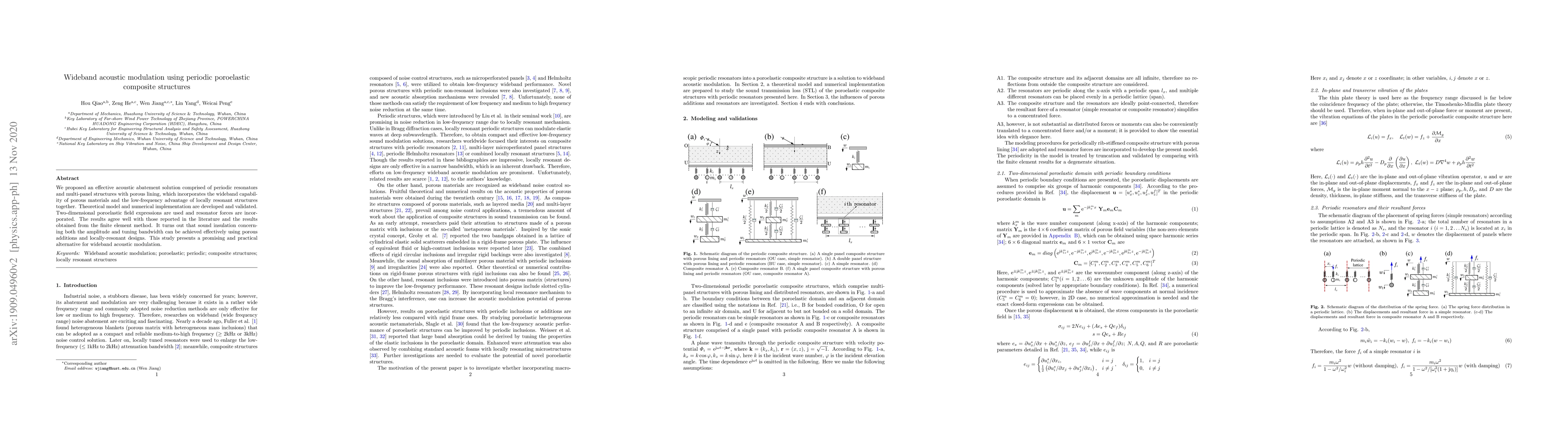 This paper proposes a wideband acoustic modulation solution using periodic poroelastic composite structures, combining porous materials' wideband capability with locally resonant structures' low-frequency advantage. The theoretical model and numerical simulations validate the effectiveness of this approach, showing promising results for practical acoustic abatement.