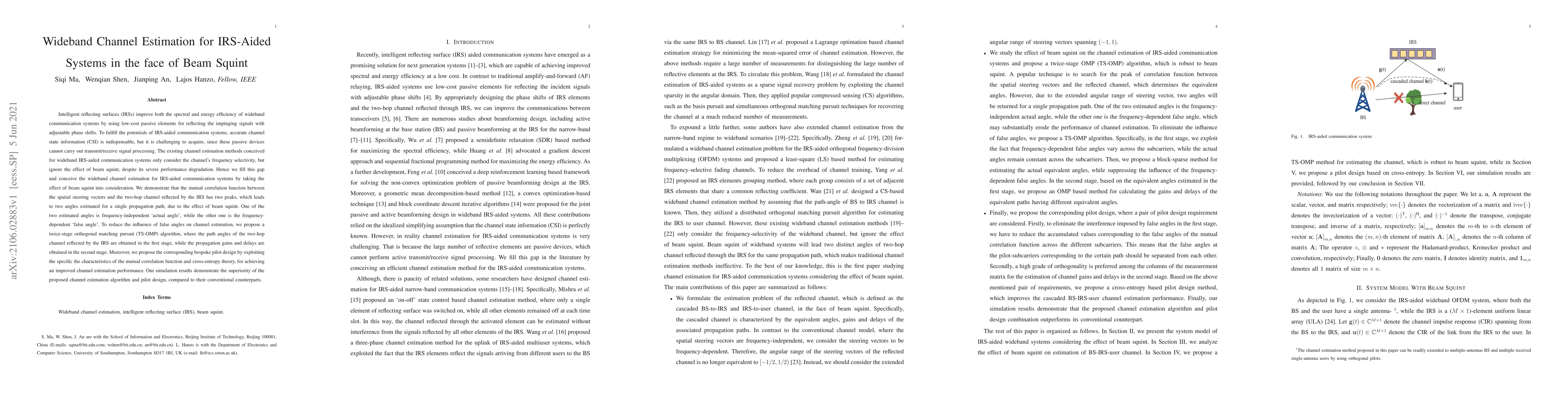 This paper proposes a novel wideband channel estimation method for IRS-aided communication systems that accounts for beam squint, which significantly impacts performance. The authors introduce a twin-stage orthogonal matching pursuit (TS-OMP) algorithm to mitigate the effects of false angles resulting from beam squint.