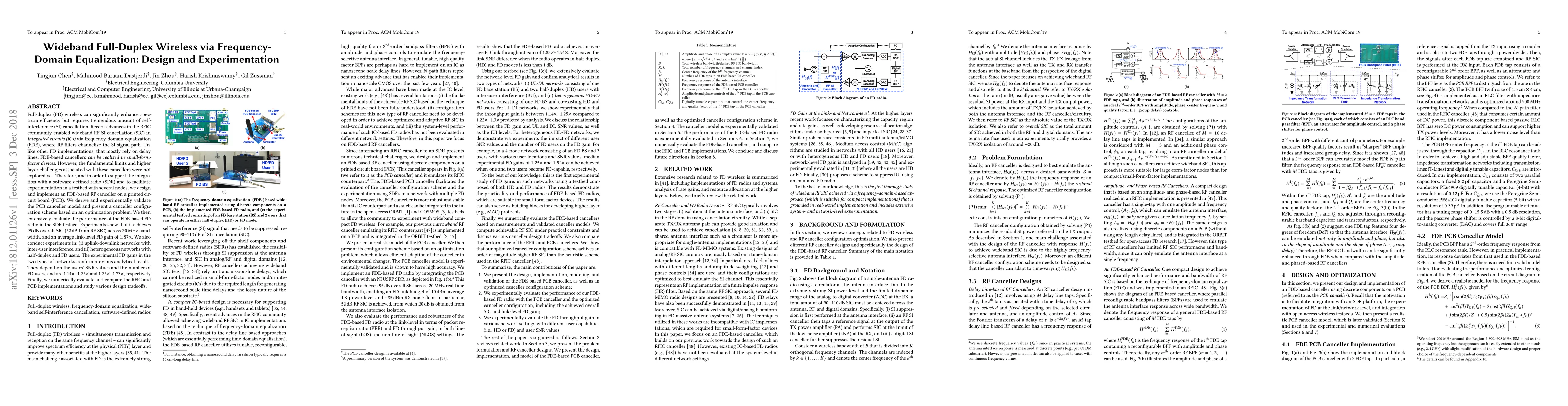 This paper designs and experiments with a full-duplex wireless system using frequency-domain equalization for self-interference cancellation, achieving 95dB SIC across 20MHz. The study evaluates the system's performance in various network configurations, confirming theoretical gains and exploring design tradeoffs between RFIC and PCB implementations.