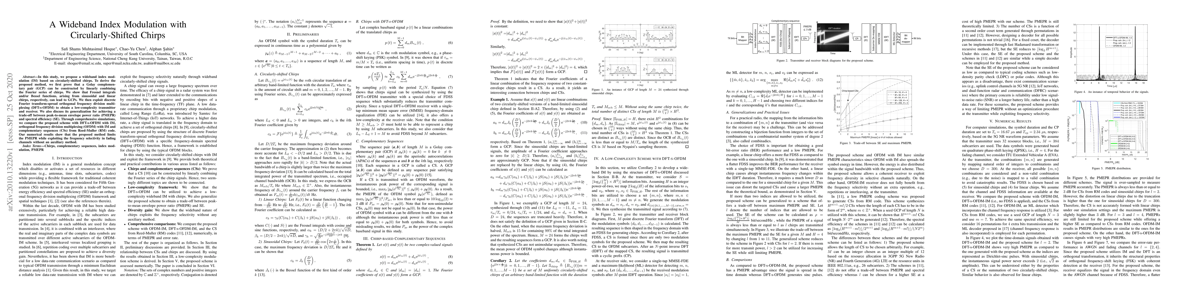 In this study, we propose a wideband index modulation (IM) based on circularly-shifted chirps. To derive the proposed method, we first prove that a Golay complementary pair (GCP) can be constructed by linearly combining the Fourier series of chirps. We show that Fresnel integrals and/or Bessel functions, arising from sinusoidal and linear chirps, respectively, can lead to GCPs. We then exploit discrete Fourier transform-spread orthogonal frequency division multiplexing (DFT-s-OFDM) to obtain a low-complexity transmitter and receiver. We also discuss its generalization for achieving a trade-off between peak-to-mean envelope power ratio (PMEPR) and spectral efficiency (SE). Through comprehensive simulations, we compare the proposed scheme with DFT-s-OFDM with IM, orthogonal frequency division multiplexing (OFDM) with IM and complementary sequences (CSs) from Reed-Muller (RM) code. Our numerical results show that the proposed method limits the PMEPR while exploiting the frequency.