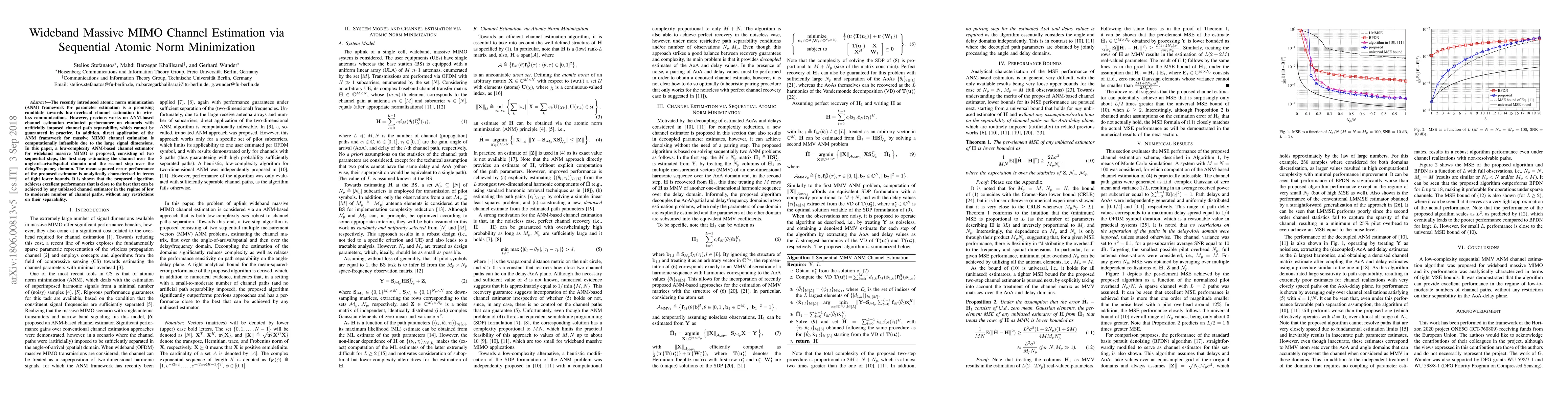 The paper proposes a low-complexity sequential atomic norm minimization (ANM) algorithm for wideband massive MIMO channel estimation, splitting the estimation into spatial and frequency domains.