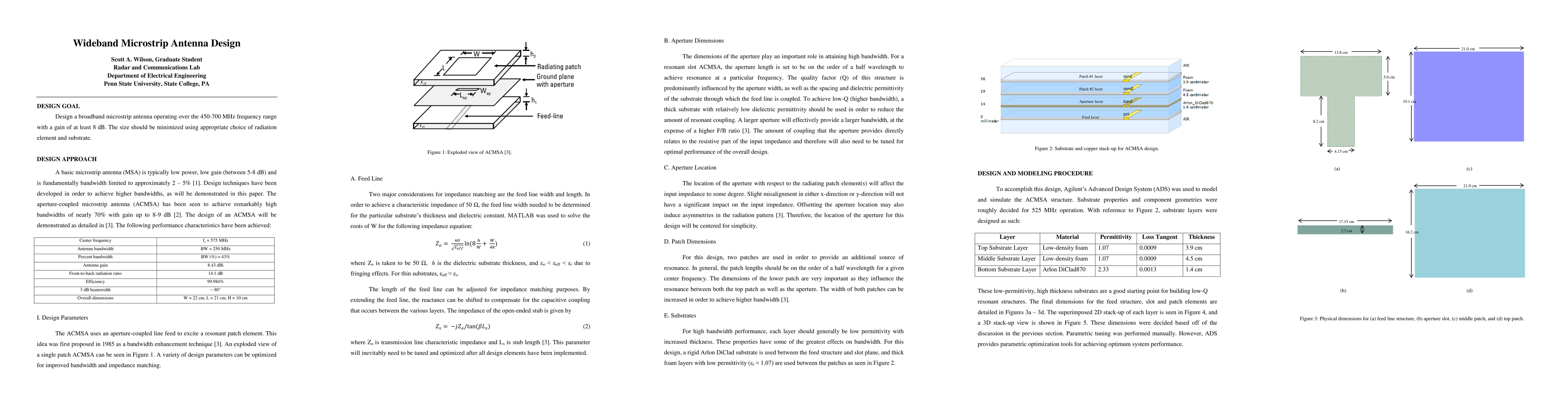 The paper presents a wideband aperture-coupled microstrip antenna design with double-stacked patches, demonstrating effective use of substrate properties and patch dimensions to achieve high bandwidth.