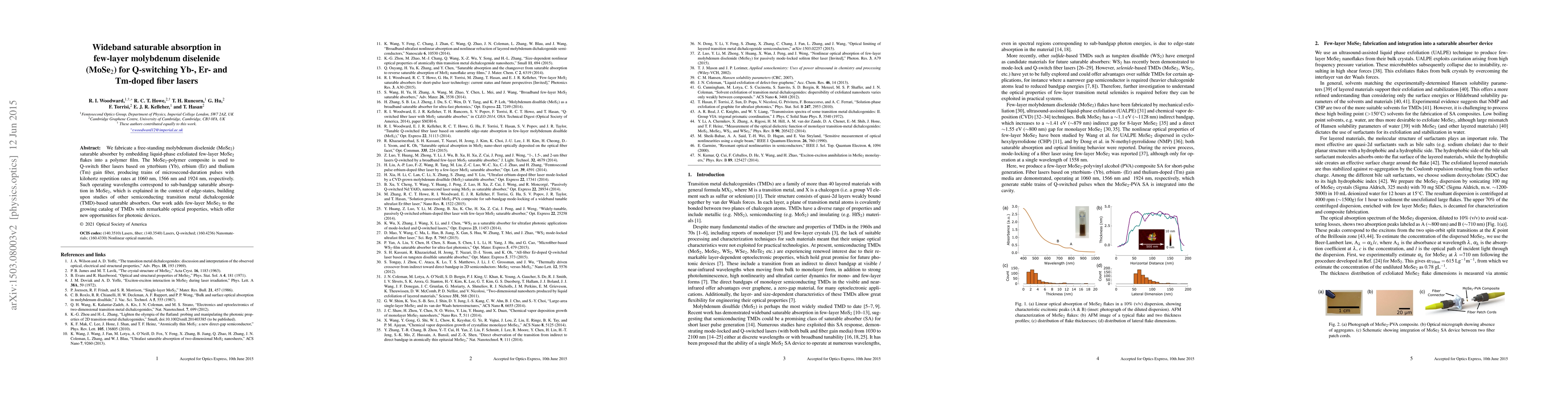 This paper reports on the fabrication of a MoSe2-polymer composite saturable absorber for Q-switching in Yb-, Er-, and Tm-doped fiber lasers, enabling microsecond-duration pulse generation at 1060 nm, 1566 nm, and 1924 nm, respectively. The study attributes the sub-bandgap saturable absorption to edge-states in few-layer MoSe2, expanding the utility of TMDs in photonic devices.