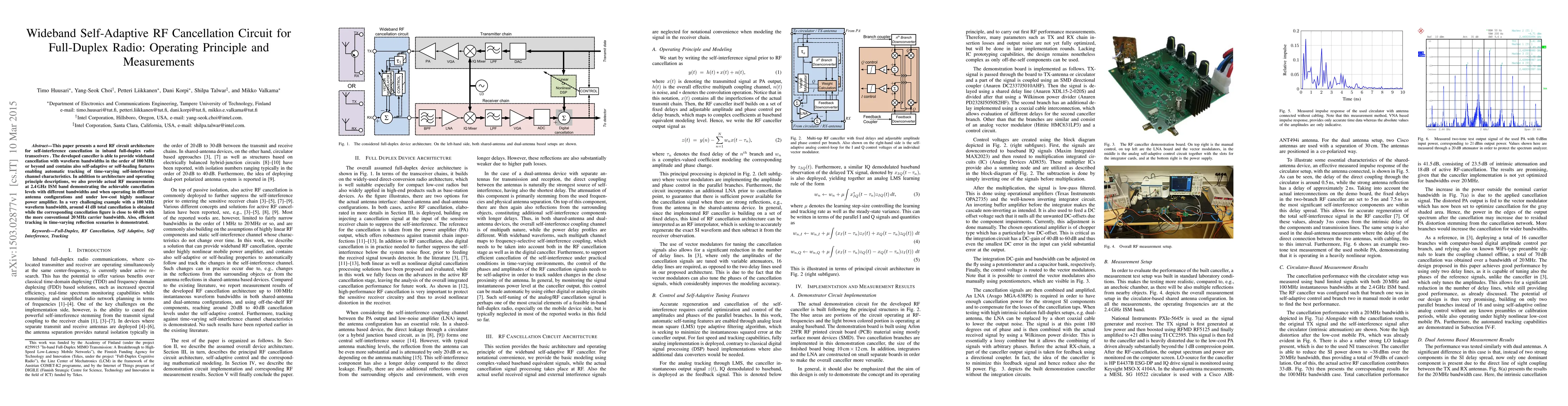 This paper introduces a self-adaptive RF cancellation circuit for full-duplex radios, achieving wideband cancellation up to 100 MHz and demonstrating effective self-interference tracking. RF measurements at 2.4 GHz show up to 41 dB cancellation in challenging scenarios.