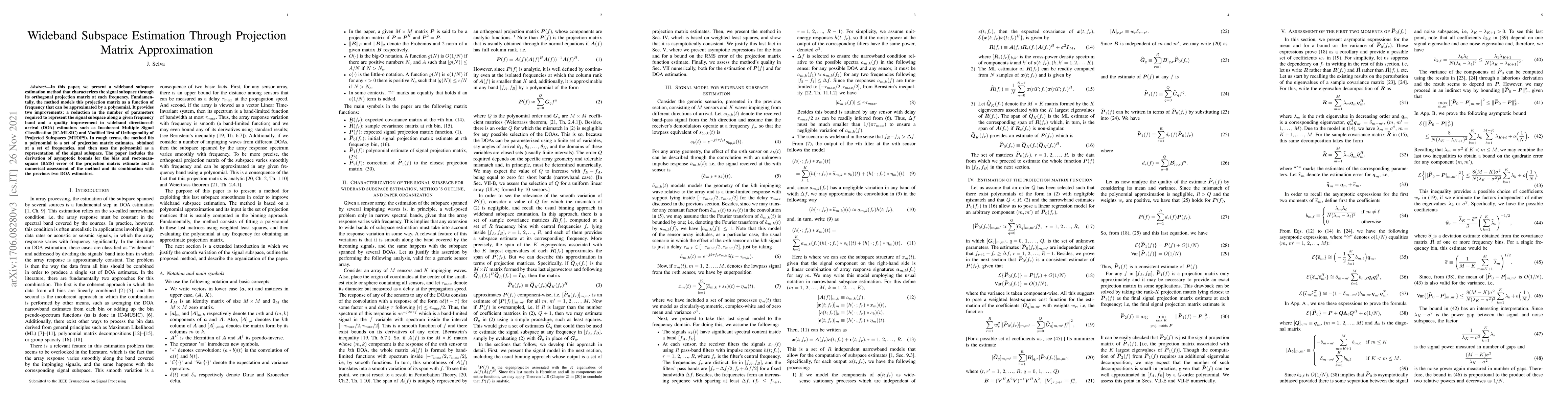 This paper introduces a wideband subspace estimation method that approximates the orthogonal projection matrix of the signal subspace using polynomial functions, reducing parameters and improving wideband direction-of-arrival estimators like IC-MUSIC and MTOPS. The method fits a polynomial to projection matrix estimates across frequencies, providing asymptotic bounds and numerical assessments.