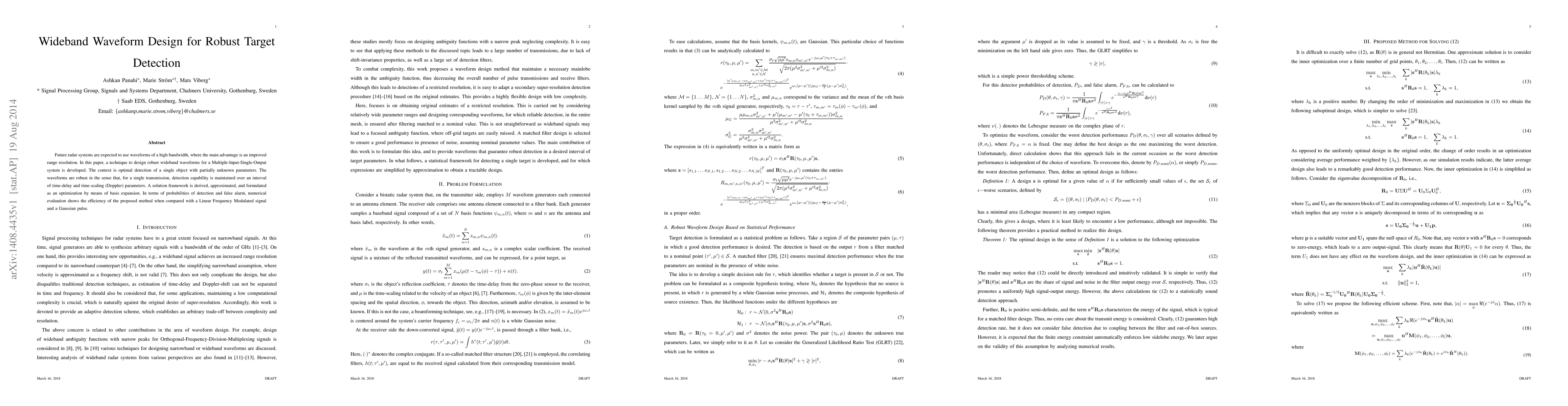 Future radar systems are expected to use waveforms of a high bandwidth, where the main advantage is an improved range resolution. In this paper, a technique to design robust wideband waveforms for a Multiple-Input-Single-Output system is developed. The context is optimal detection of a single object with partially unknown parameters. The waveforms are robust in the sense that, for a single transmission, detection capability is maintained over an interval of time-delay and time-scaling (Doppler) parameters. A solution framework is derived, approximated, and formulated as an optimization by means of basis expansion. In terms of probabilities of detection and false alarm, numerical evaluation shows the efficiency of the proposed method when compared with a Linear Frequency Modulated signal and a Gaussian pulse.