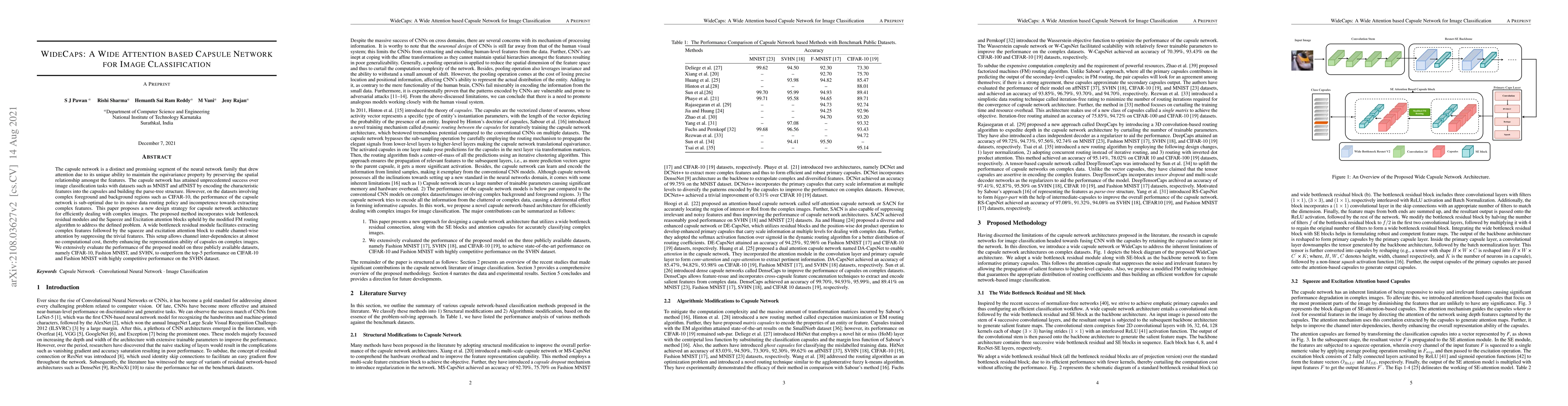 The capsule network is a distinct and promising segment of the neural network family that drew attention due to its unique ability to maintain the equivariance property by preserving the spatial relationship amongst the features. The capsule network has attained unprecedented success over image classification tasks with datasets such as MNIST and affNIST by encoding the characteristic features into the capsules and building the parse-tree structure. However, on the datasets involving complex foreground and background regions such as CIFAR-10, the performance of the capsule network is sub-optimal due to its naive data routing policy and incompetence towards extracting complex features. This paper proposes a new design strategy for capsule network architecture for efficiently dealing with complex images. The proposed method incorporates wide bottleneck residual modules and the Squeeze and Excitation attention blocks upheld by the modified FM routing algorithm to address the defined problem. A wide bottleneck residual module facilitates extracting complex features followed by the squeeze and excitation attention block to enable channel-wise attention by suppressing the trivial features. This setup allows channel inter-dependencies at almost no computational cost, thereby enhancing the representation ability of capsules on complex images. We extensively evaluate the performance of the proposed model on three publicly available datasets, namely CIFAR-10, Fashion MNIST, and SVHN, to outperform the top-5 performance on CIFAR-10 and Fashion MNIST with highly competitive performance on the SVHN dataset.