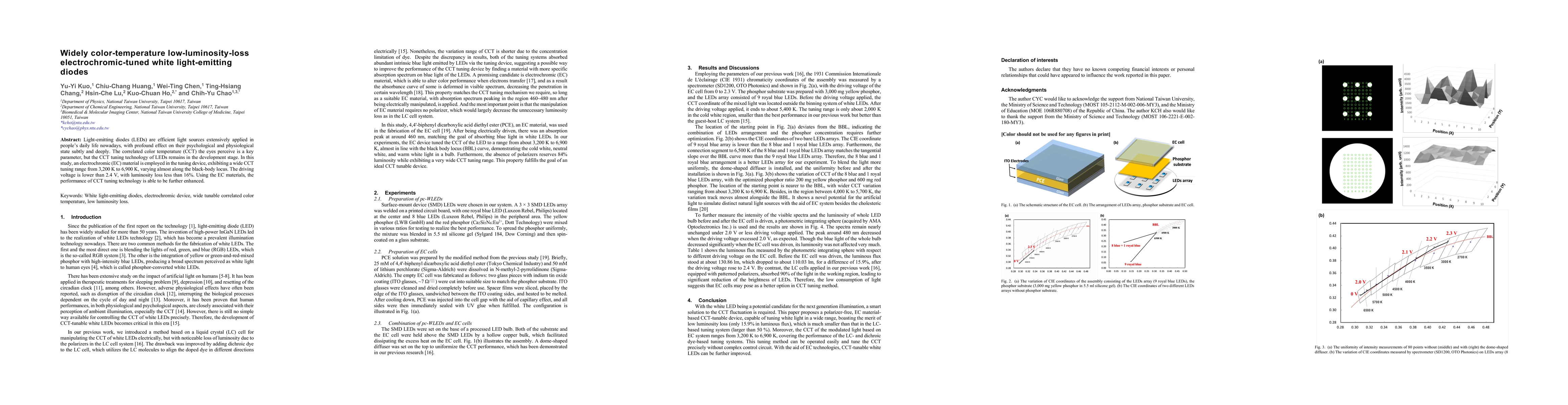 Light-emitting diodes (LEDs) are efficient light sources extensively applied in people's daily life nowadays, with profound effect on their psychological and physiological state subtly and deeply. The correlated color temperature (CCT) the eyes perceive is a key parameter, but the CCT tuning technology of LEDs remains in the development stage. In this study, an electrochromic (EC) material is employed in the tuning device, exhibiting a wide CCT tuning range from 3,200 K to 6,900 K, varying almost along the black-body locus. The driving voltage is lower than 2.4 V, with luminosity loss less than 16%. Using the EC materials, the performance of CCT tuning technology is able to be further enhanced.