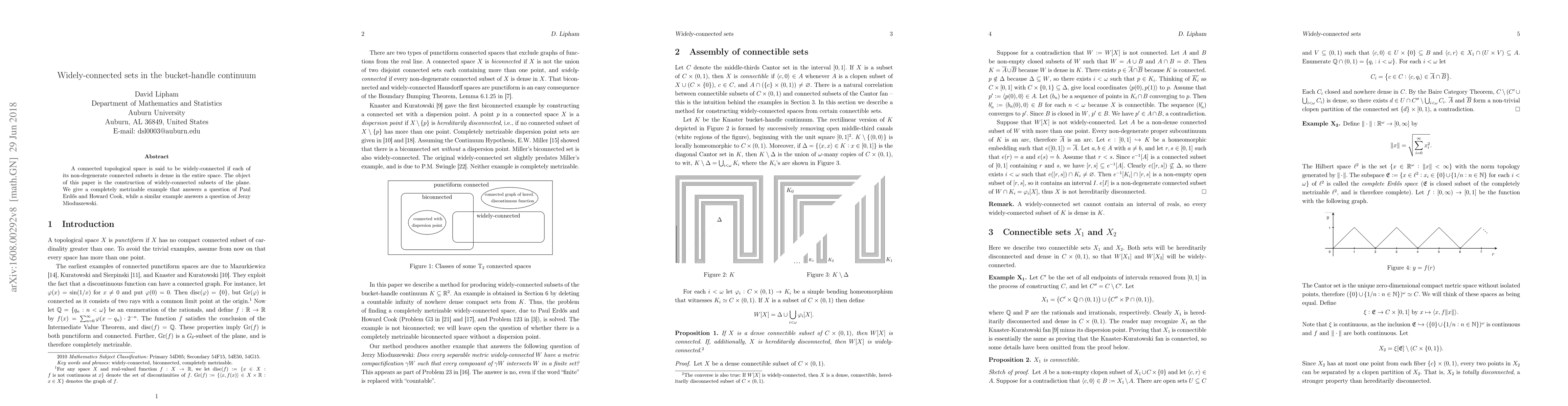 A connected topological space is said to be widely-connected if each of its non-degenerate connected subsets is dense in the entire space. The object of this paper is the construction of widely-connected subsets of the plane. We give a completely metrizable example that answers a question of Paul Erd\H{o}s and Howard Cook, while a similar example answers a question of Jerzy Mioduszewski.