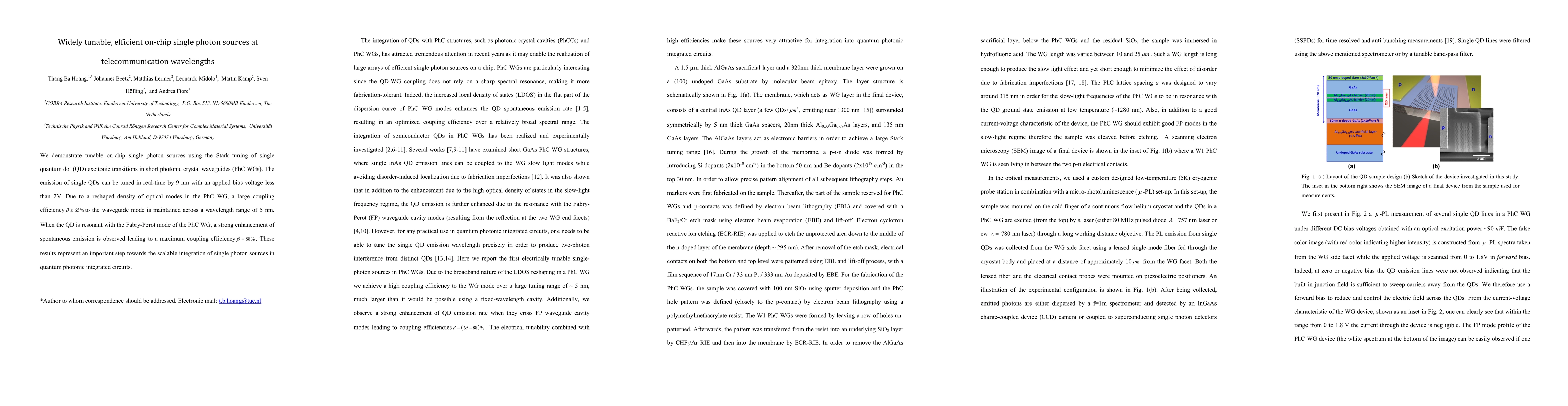 This paper demonstrates tunable on-chip single photon sources via Stark tuning of quantum dot excitonic transitions in photonic crystal waveguides, achieving real-time tuning of 9 nm with a low bias voltage. The design maintains high coupling efficiency over a 5 nm wavelength range, paving the way for scalable quantum photonic circuits.