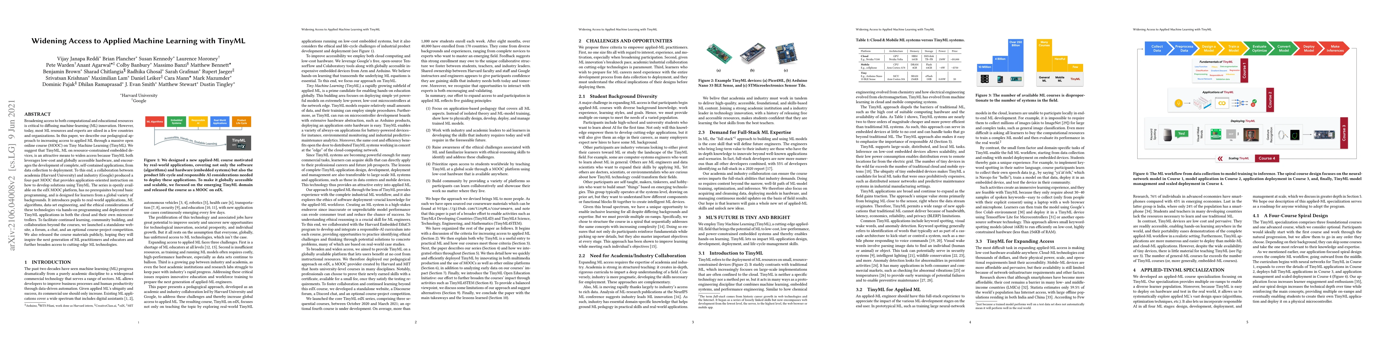 This paper outlines a MOOC on Tiny Machine Learning (TinyML) developed by Harvard University and Google to democratize access to applied ML by leveraging low-cost, globally accessible hardware. The course, freely available on edX, aims to teach real-world TinyML applications and ethical considerations, fostering global participation and collaboration through additional online resources.