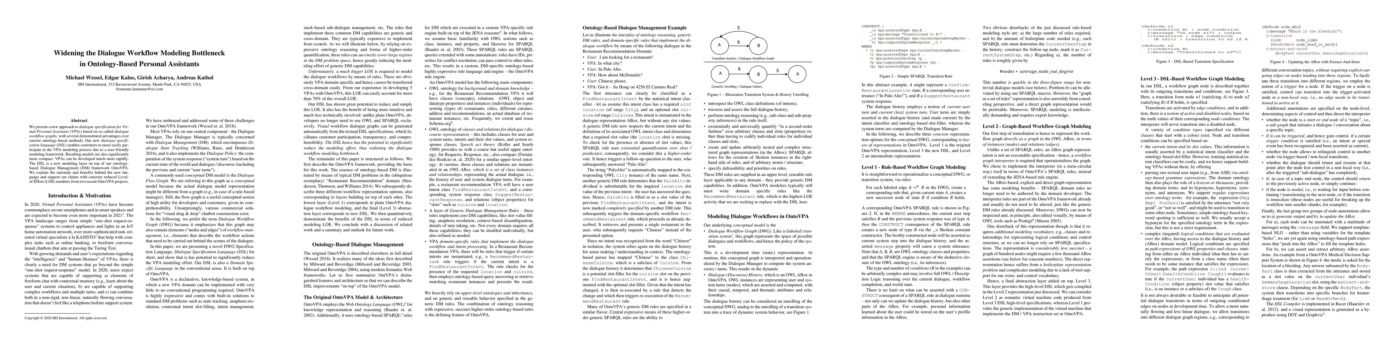 We present a new approach to dialogue specification for Virtual Personal Assistants (VPAs) based on so-called dialogue workflow graphs, with several demonstrated advantages over current ontology-based methods. Our new dialogue specification language (DSL) enables customers to more easily participate in the VPA modeling process due to a user-friendly modeling framework. Resulting models are also significantly more compact. VPAs can be developed much more rapidly. The DSL is a new modeling layer on top of our ontology-based Dialogue Management (DM) framework OntoVPA. We explain the rationale and benefits behind the new language and support our claims with concrete reduced Level-of-Effort (LOE) numbers from two recent OntoVPA projects.