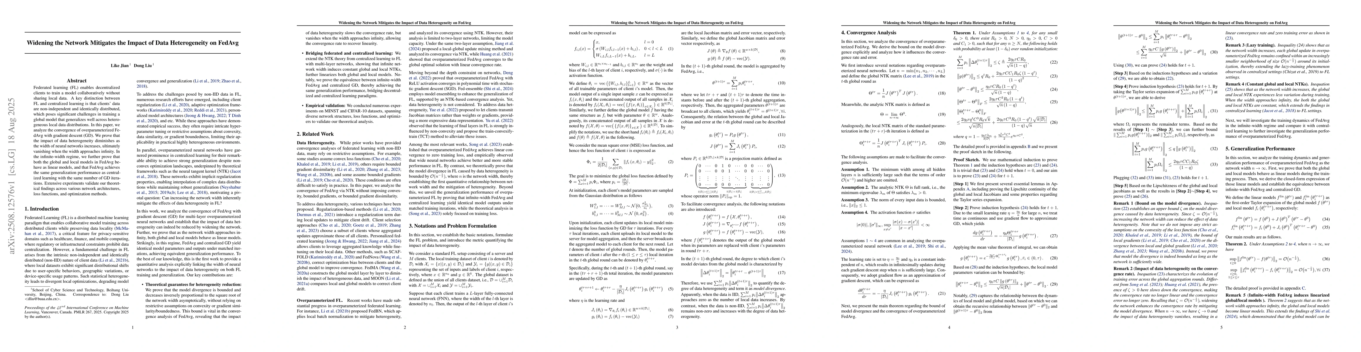 Federated learning (FL) enables decentralized clients to train a model collaboratively without sharing local data. A key distinction between FL and centralized learning is that clients' data are non-independent and identically distributed, which poses significant challenges in training a global model that generalizes well across heterogeneous local data distributions. In this paper, we analyze the convergence of overparameterized FedAvg with gradient descent (GD). We prove that the impact of data heterogeneity diminishes as the width of neural networks increases, ultimately vanishing when the width approaches infinity. In the infinite-width regime, we further prove that both the global and local models in FedAvg behave as linear models, and that FedAvg achieves the same generalization performance as centralized learning with the same number of GD iterations. Extensive experiments validate our theoretical findings across various network architectures, loss functions, and optimization methods.