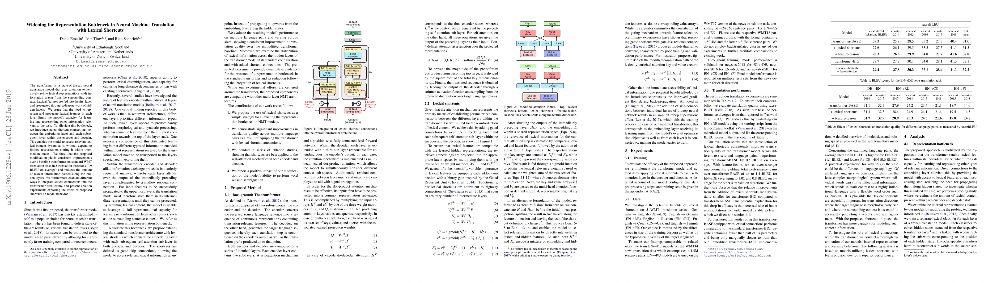 The transformer is a state-of-the-art neural translation model that uses attention to iteratively refine lexical representations with information drawn from the surrounding context. Lexical features are fed into the first layer and propagated through a deep network of hidden layers. We argue that the need to represent and propagate lexical features in each layer limits the model's capacity for learning and representing other information relevant to the task. To alleviate this bottleneck, we introduce gated shortcut connections between the embedding layer and each subsequent layer within the encoder and decoder. This enables the model to access relevant lexical content dynamically, without expending limited resources on storing it within intermediate states. We show that the proposed modification yields consistent improvements over a baseline transformer on standard WMT translation tasks in 5 translation directions (0.9 BLEU on average) and reduces the amount of lexical information passed along the hidden layers. We furthermore evaluate different ways to integrate lexical connections into the transformer architecture and present ablation experiments exploring the effect of proposed shortcuts on model behavior.