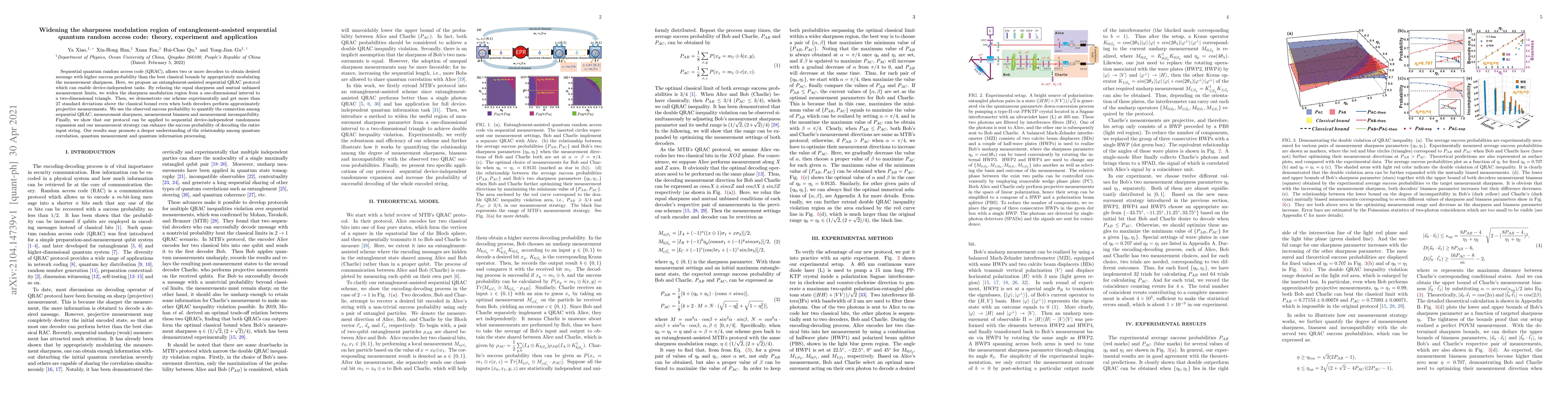 This paper proposes an entanglement-assisted sequential quantum random access code (QRAC) protocol that widens the sharpness modulation region, enabling device-independent tasks. Experimental results demonstrate a significant success probability above classical bounds, highlighting the connection between quantum correlation, measurement, and information processing.
