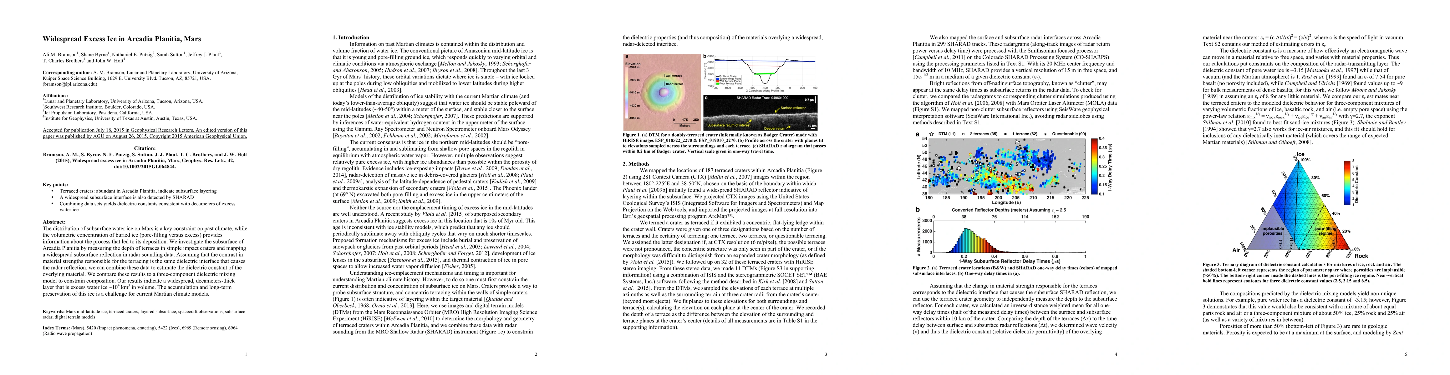 This study investigates subsurface water ice in Arcadia Planitia, Mars, revealing a decameters-thick layer of excess water ice (~10^4 km^3) using radar data and crater terrace measurements. The findings challenge current Martian climate models to explain the accumulation and preservation of this ice.
