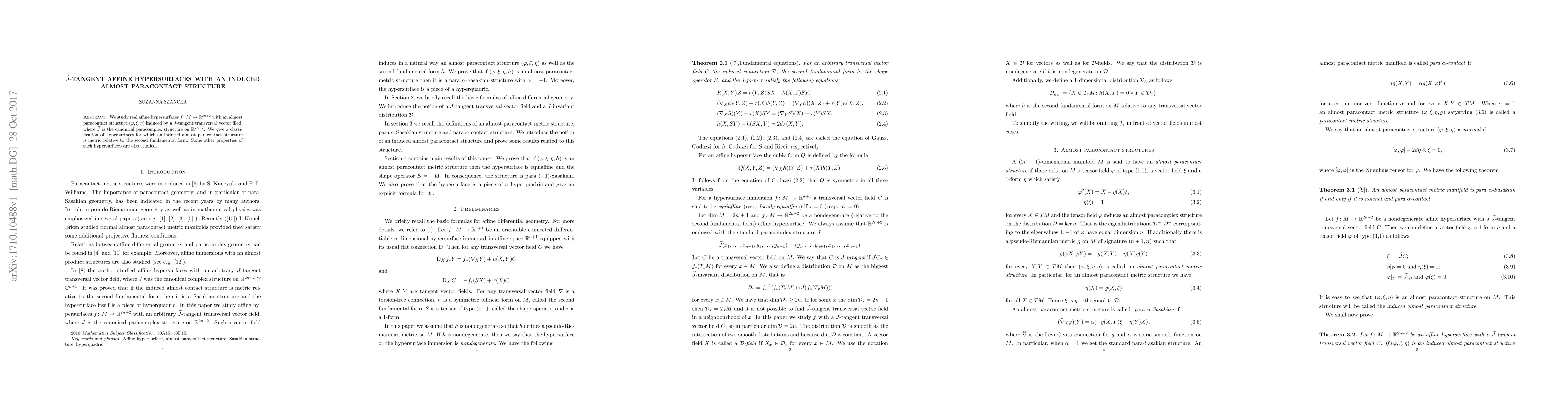 This paper classifies real affine hypersurfaces endowed with an almost paracontact structure induced by a $\widetilde{J}$-tangent vector field, showing that these structures are metric relative to the second fundamental form. Additional properties of these hypersurfaces are also investigated.