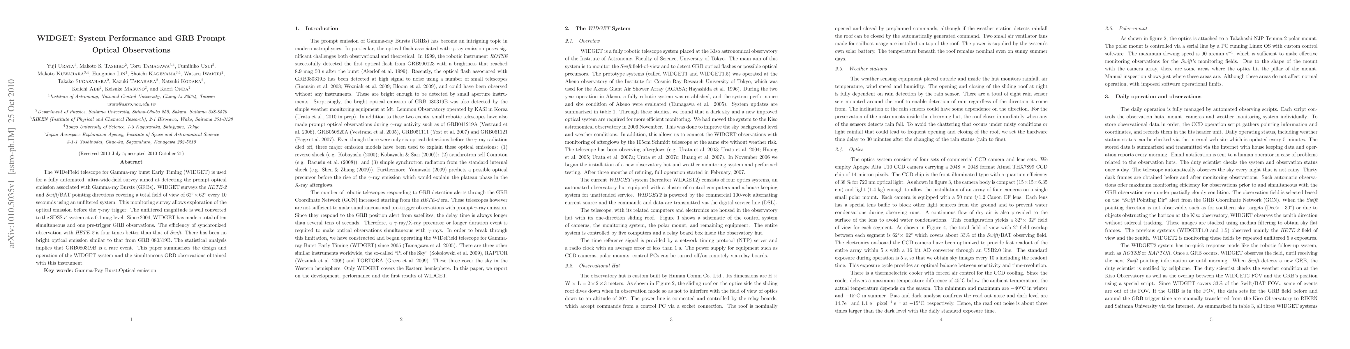 The WIDeField telescope for Gamma-ray burst Early Timing (WIDGET) is used for a fully automated, ultra-wide-field survey aimed at detecting the prompt optical emission associated with Gamma-ray Bursts (GRBs). WIDGET surveys the HETE-2 and Swift/BAT pointing directions covering a total field of view of 62 degree x 62 degree every 10 secounds using an unfiltered system. This monitoring survey allows exploration of the optical emission before the gamma-ray trigger. The unfiltered magnitude is well converted to the SDSS r' system at a 0.1 mag level. Since 2004, WIDGET has made a total of ten simultaneous and one pre-trigger GRB observations. The efficiency of synchronized observation with HETE-2 is four times better than that of Swift. There has been no bright optical emission similar to that from GRB 080319B. The statistical analysis implies that GRB080319B is a rare event. This paper summarizes the design and operation of the WIDGET system and the simultaneous GRB observations obtained with this instrument.