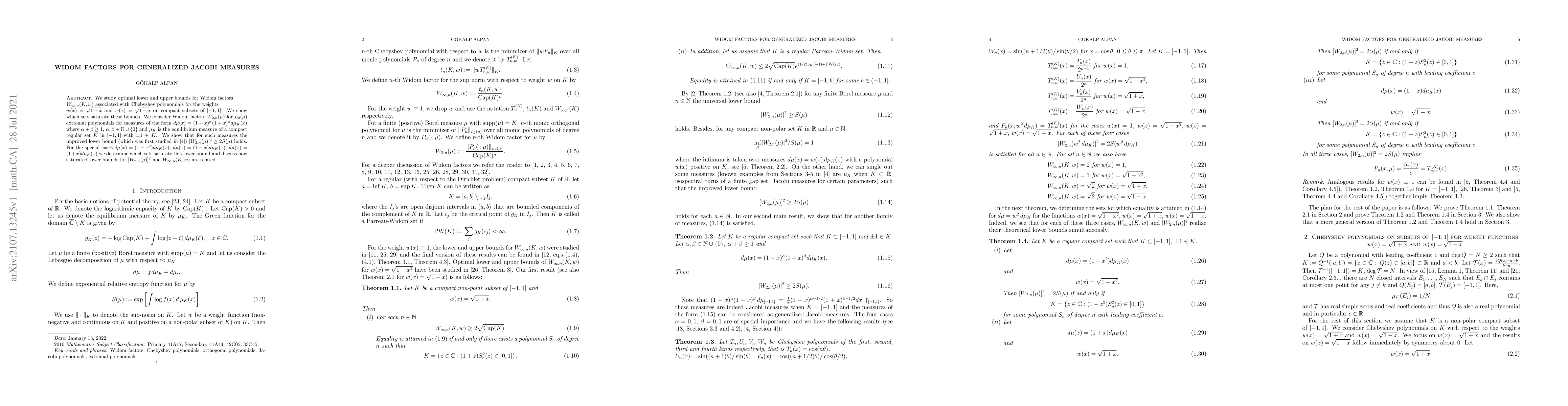 We study optimal lower and upper bounds for Widom factors $W_{\infty,n}(K,w)$ associated with Chebyshev polynomials for the weights $w(x)=\sqrt{1+x}$ and $w(x)=\sqrt{1-x}$ on compact subsets of $[-1,1]$. We show which sets saturate these bounds. We consider Widom factors $W_{2,n}(\mu)$ for $L_2(\mu)$ extremal polynomials for measures of the form $d\mu(x)=(1-x)^\alpha (1+x)^\beta d\mu_K(x)$ where $\alpha+\beta\geq 1$, $\alpha,\beta\in\mathbb{N}\cup \{0\}$ and $\mu_K$ is the equilibrium measure of a compact regular set $K$ in $[-1,1]$ with $\pm 1\in K$. We show that for such measures the improved lower bound $[W_{2,n}(\mu)]^2\geq 2S(\mu)$ holds. For the special cases $d\mu(x)=(1-x^2)d\mu_K(x)$, $d\mu(x)=(1-x)d\mu_K(x)$, $d\mu(x)=(1+x)d\mu_K(x)$ we determine which sets saturate this lower bound and discuss how saturated lower bounds for $[W_{2,n}(\mu)]^2$ and $W_{\infty,n}(K,w)$ are related.