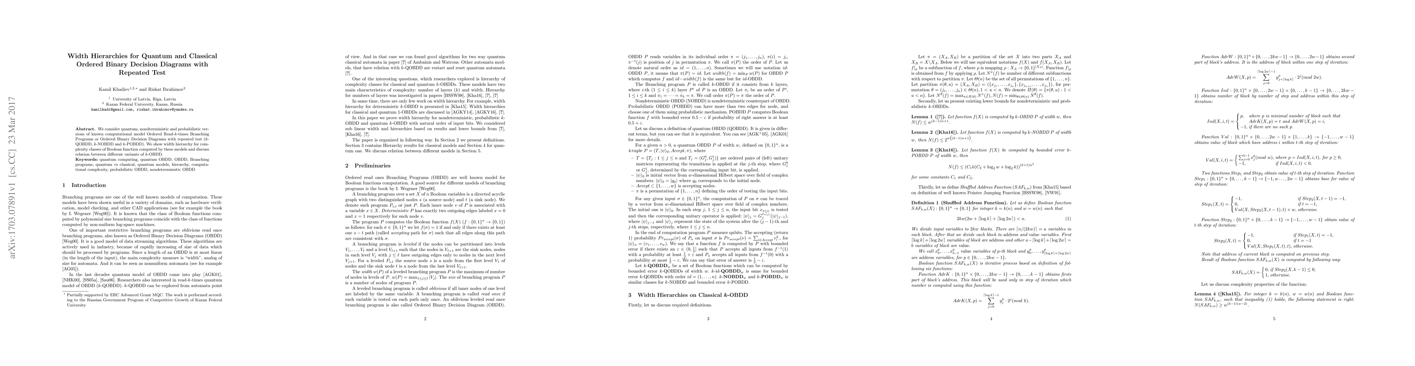 This paper investigates the complexity classes of Boolean functions computed by quantum, nondeterministic, and probabilistic versions of Ordered Binary Decision Diagrams with repeated test. It establishes a width hierarchy for these models and explores the relationships between different variants of Ordered Binary Decision Diagrams.