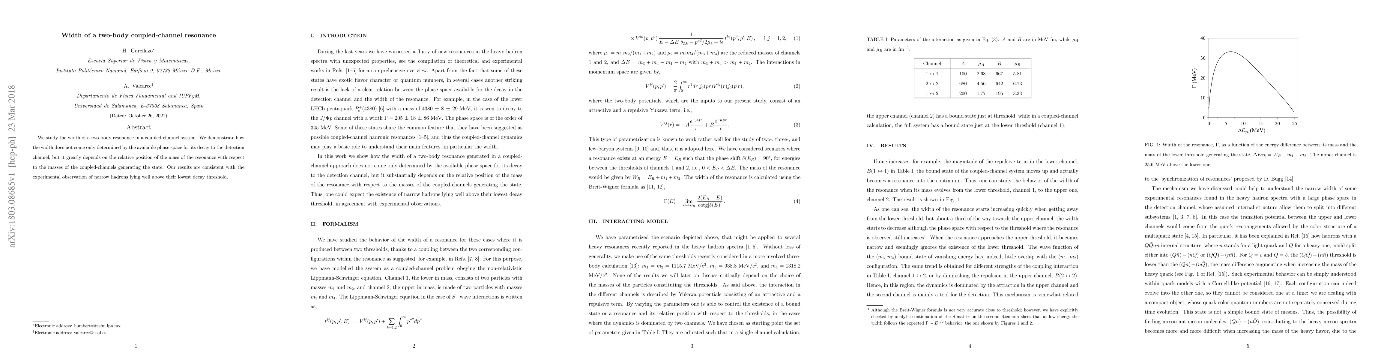 We study the width of a two-body resonance in a coupled-channel system. We demonstrate how the width does not come only determined by the available phase space for its decay to the detection channel, but it greatly depends on the relative position of the mass of the resonance with respect to the masses of the coupled-channels generating the state. Our results are consistent with the experimental observation of narrow hadrons lying well above their lowest decay threshold.