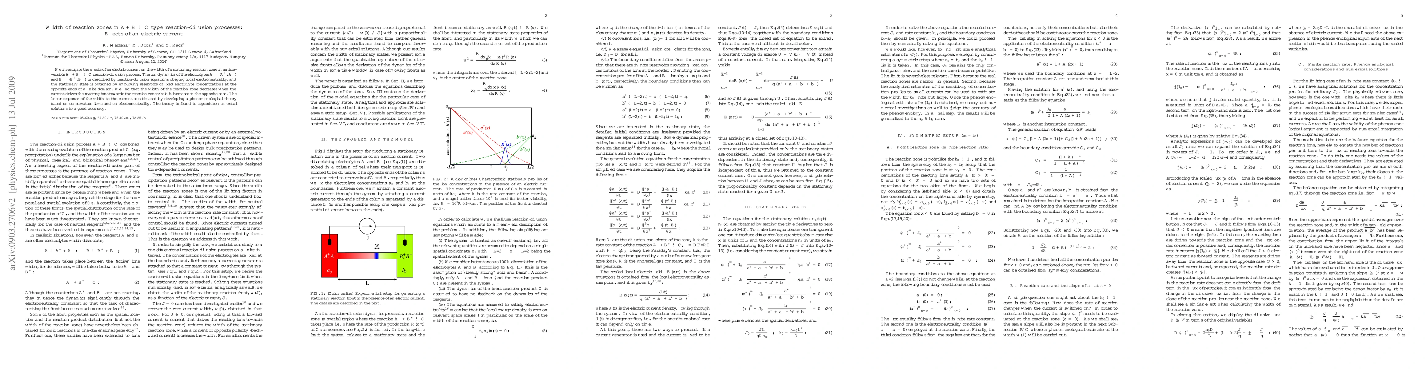 This paper examines how an electric current influences the width of stationary reaction zones in an irreversible A^- + B^+ -> C reaction-diffusion process. The study finds that the width decreases when the current drives ions towards the reaction zone, while it increases when the current drives them away, with a linear response estimated through a phenomenological theory based on conservation laws and electroneutrality.