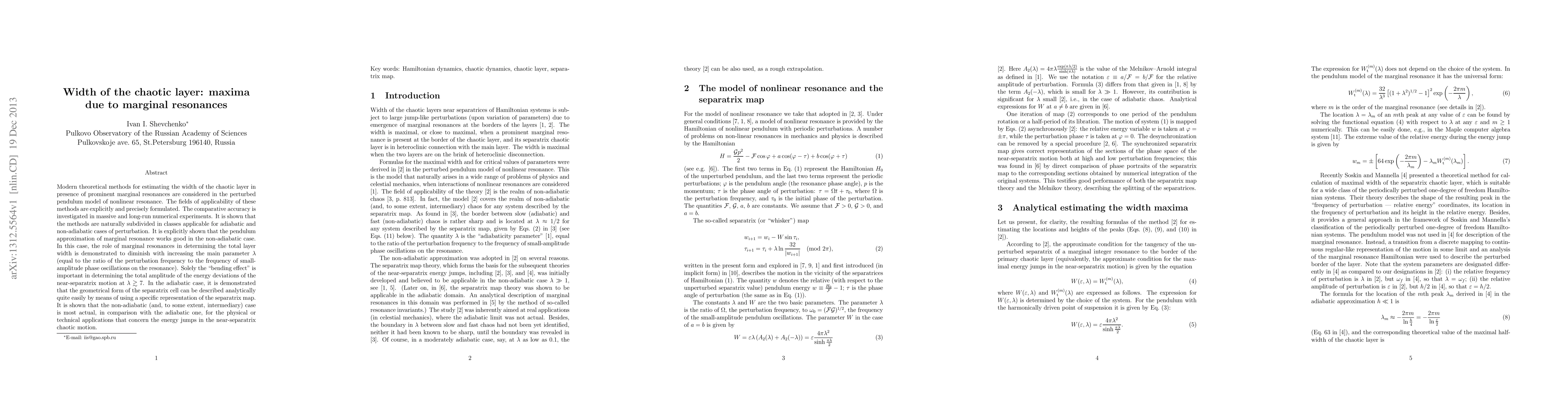 This paper investigates methods for estimating the chaotic layer width in perturbed pendulum models, focusing on marginal resonances. It demonstrates that these methods are more accurate for non-adiabatic cases, where the "bending effect" dominates for high perturbation frequency ratios, while the adiabatic case allows for simple analytical descriptions of the separatrix cell.