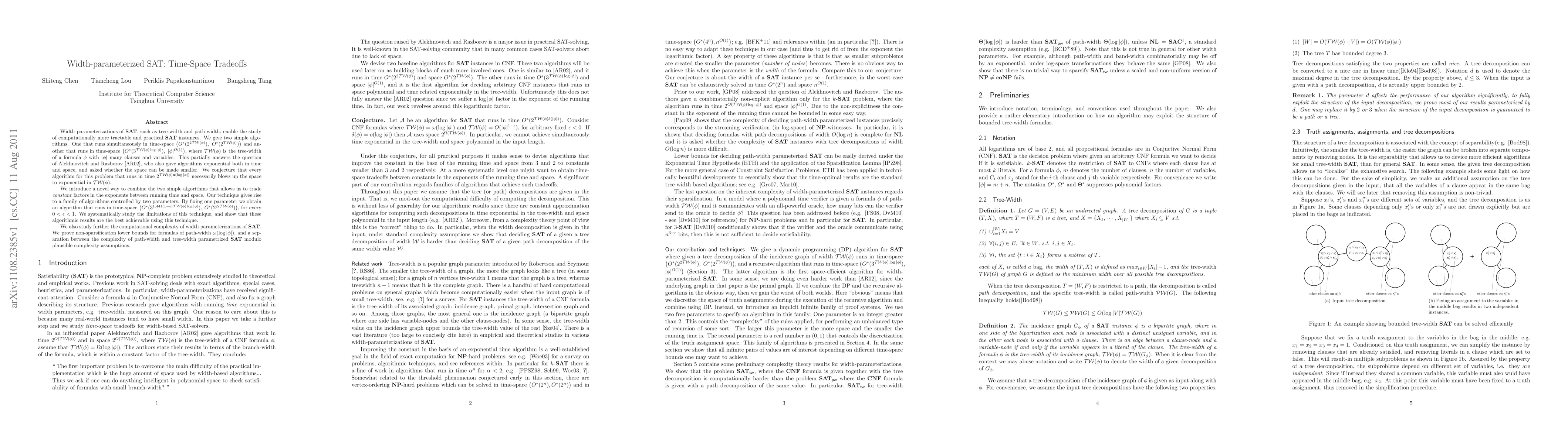 Width parameterizations of SAT, such as tree-width and path-width, enable the study of computationally more tractable and practical SAT instances. We give two simple algorithms. One that runs simultaneously in time-space $(O^*(2^{2tw(\phi)}), O^*(2^{tw(\phi)}))$ and another that runs in time-space $(O^*(3^{tw(\phi)\log{|\phi|}}),|\phi|^{O(1)})$, where $tw(\phi)$ is the tree-width of a formula $\phi$ with $|\phi|$ many clauses and variables. This partially answers the question of Alekhnovitch and Razborov, who also gave algorithms exponential both in time and space, and asked whether the space can be made smaller. We conjecture that every algorithm for this problem that runs in time $2^{tw(\phi)\mathbf{o(\log{|\phi|})}}$ necessarily blows up the space to exponential in $tw(\phi)$. We introduce a novel way to combine the two simple algorithms that allows us to trade \emph{constant} factors in the exponents between running time and space. Our technique gives rise to a family of algorithms controlled by two parameters. By fixing one parameter we obtain an algorithm that runs in time-space $(O^*(3^{1.441(1-\epsilon)tw(\phi)\log{|\phi|}}), O^*(2^{2\epsilon tw(\phi)}))$, for every $0<\epsilon<1$. We systematically study the limitations of this technique, and show that these algorithmic results are the best achievable using this technique. We also study further the computational complexity of width parameterizations of SAT. We prove non-sparsification lower bounds for formulas of path-width $\omega(\log|\phi|)$, and a separation between the complexity of path-width and tree-width parametrized SAT modulo plausible complexity assumptions.