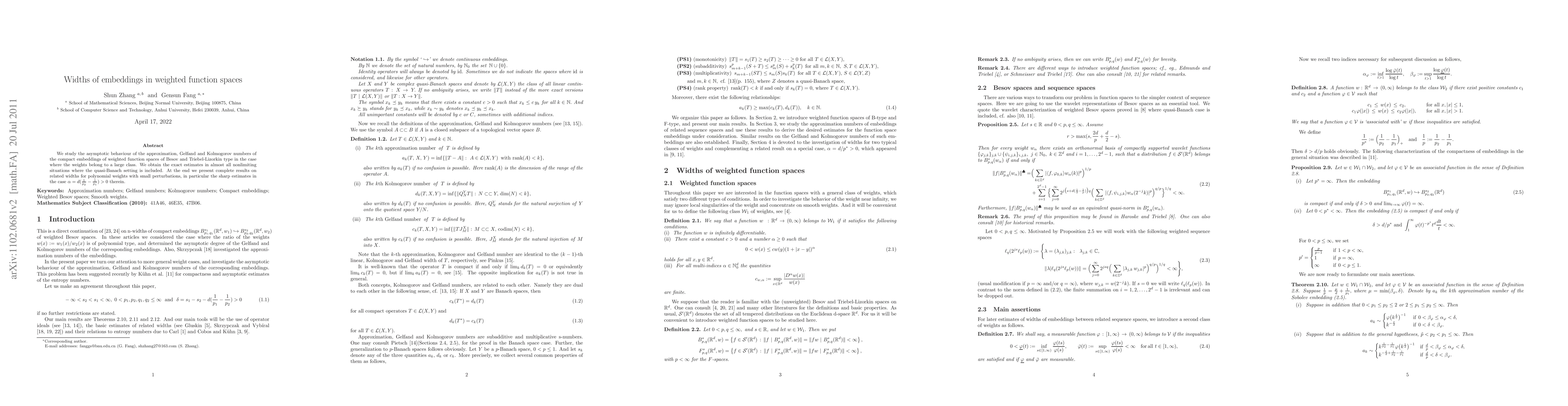 We study the asymptotic behaviour of the approximation, Gelfand and Kolmogorov numbers of the compact embeddings of weighted function spaces of Besov and Triebel-Lizorkin type in the case where the weights belong to a large class. We obtain the exact estimates in almost all nonlimiting situations where the quasi-Banach setting is included. At the end we present complete results on related widths for polynomial weights with small perturbations, in particular the sharp estimates in the case $\alpha=d(\frac 1{p_2}-\frac 1{p_1})>0$ therein.