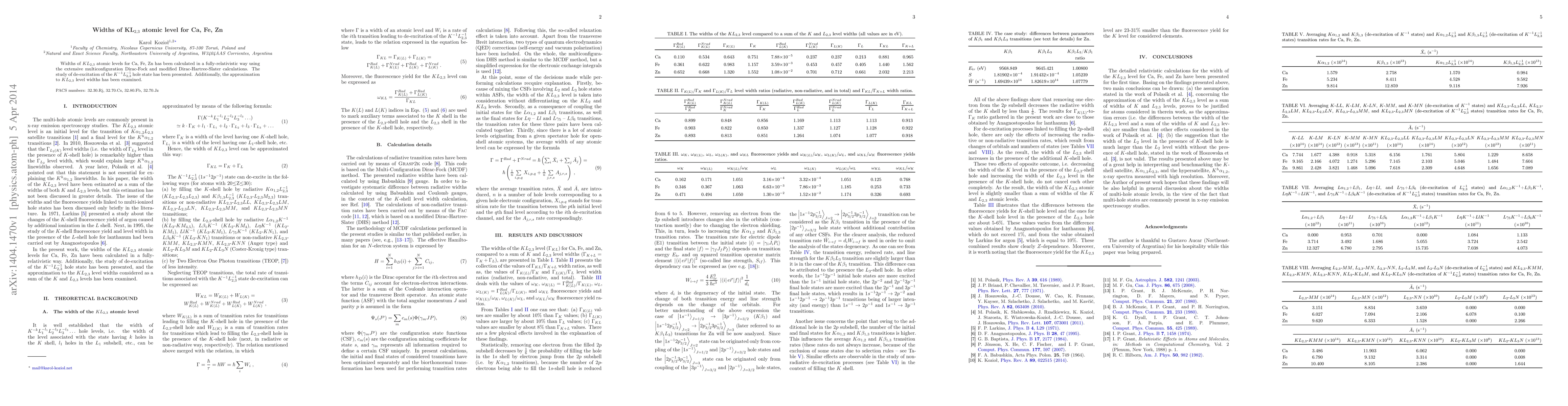 Researchers calculated atomic level widths for Ca, Fe, Zn using relativistic methods, focusing on de-excitation of a specific hole state and approximations to KL2,3 levels.