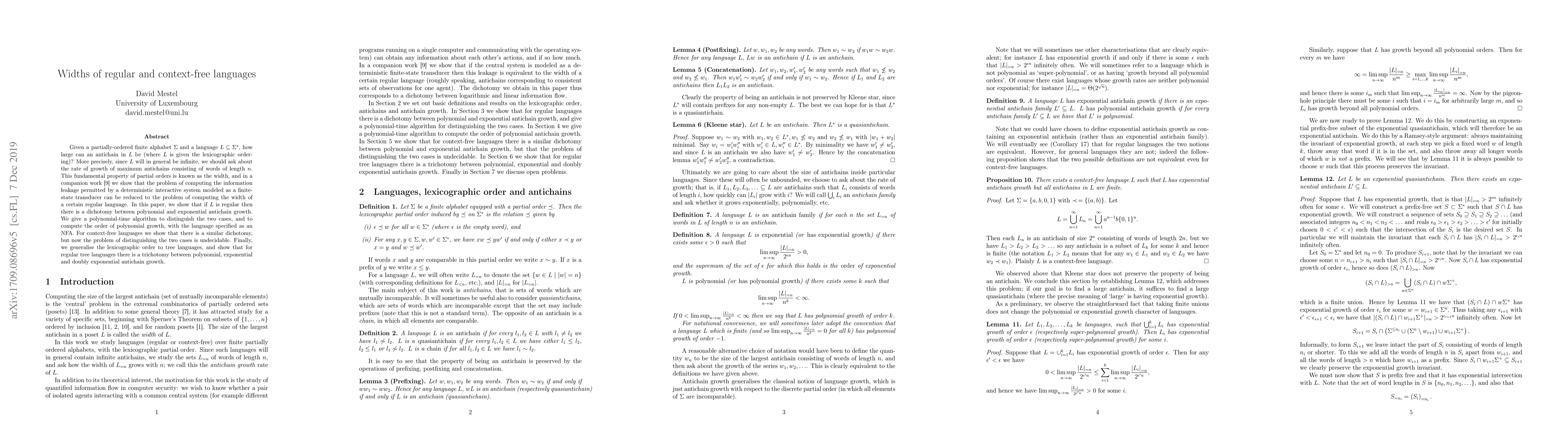 Given a partially-ordered finite alphabet $\Sigma$ and a language $L\subseteq \Sigma^*$, how large can an antichain in $L$ be (where $L$ is given the lexicographic ordering)? More precisely, since $L$ will in general be infinite, we should ask about the rate of growth of maximum antichains consisting of words of length $n$. This fundamental property of partial orders is known as the width, and in a companion work we show that the problem of computing the information leakage permitted by a deterministic interactive system modeled as a finite-state transducer can be reduced to the problem of computing the width of a certain regular language. In this paper, we show that if $L$ is regular then there is a dichotomy between polynomial and exponential antichain growth. We give a polynomial-time algorithm to distinguish the two cases, and to compute the order of polynomial growth, with the language specified as an NFA. For context-free languages we show that there is a similar dichotomy, but now the problem of distinguishing the two cases is undecidable. Finally, we generalise the lexicographic order to tree languages, and show that for regular tree languages there is a trichotomy between polynomial, exponential and doubly exponential antichain growth.