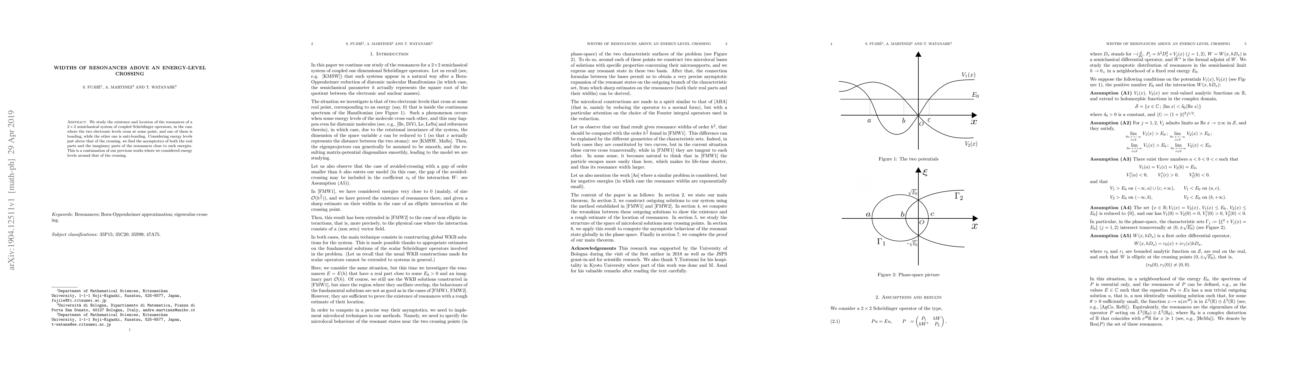 The paper studies resonances in a 2x2 coupled Schrödinger system with one bonding and one anti-bonding level crossing, finding the asymptotics of real and imaginary parts near energy levels above the crossing.