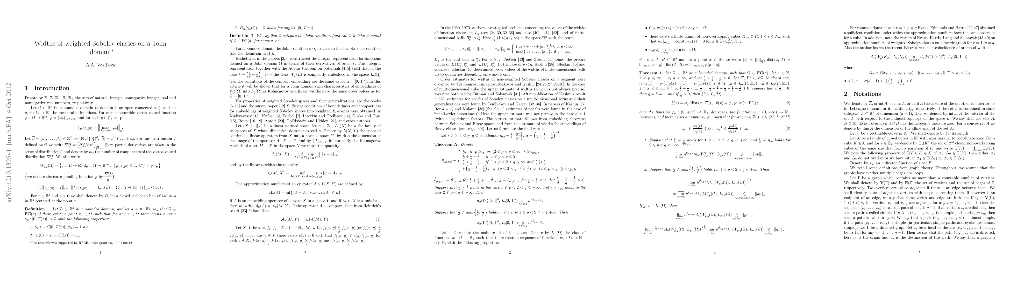 Summary: This paper provides estimates for the Kolmogorov and linear widths of weighted Sobolev classes within a John domain, contributing to the understanding of function spaces in geometric settings. The results enhance the analysis of function approximation in these specific domains.
