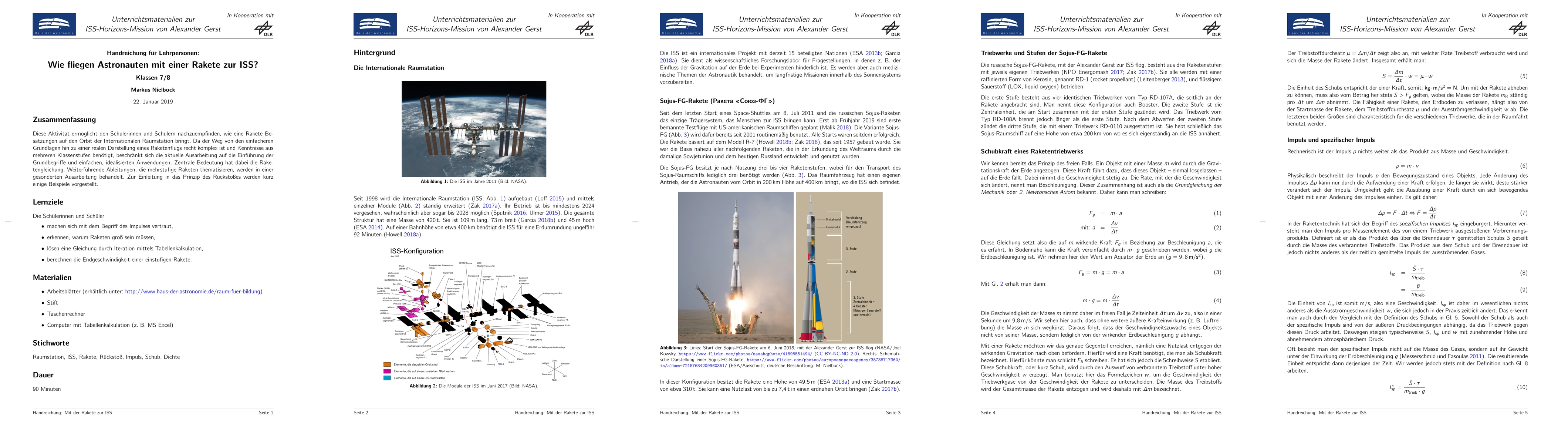 This activity was created within the framework of the "Space for Education" project, which aims at experiencing physical principles on the basis of topics related to space travel. This work enables the students to understand how a rocket brings crews into the orbit of the International Space Station. Since the way from the simpler basics to a real representation of a rocket flight is quite complex and requires knowledge from several class levels, the current paper limits itself to the introduction of basic concepts and simple, idealized applications. The rocket equation is of central importance. Further derivations, which deal with multi-stage rockets, are dealt with in a separate work. To introduce the principle of recoil, a few examples are briefly presented. Additional materials at: https://www.haus-der-astronomie.de/raum-fuer-bildung ----- Diese Aktivit\"at wurde im Rahmen des Projekts "Raum f\"ur Bildung" erstellt, welches physikalische Prinzipien anhand der Raumfahrt erlebbar macht. Diese Ausarbeitung erm\"oglicht den Sch\"ulerinnen und Sch\"ulern nachzuempfinden, wie eine Rakete Besatzungen auf den Orbit der Internationalen Raumstation bringt. Da der Weg von den einfacheren Grundlagen hin zu einer realen Darstellung eines Raketenflugs recht komplex ist und Kenntnisse aus mehreren Klassenstufen ben\"otigt, beschr\"ankt sich die aktuelle Ausarbeitung auf die Einf\"uhrung der Grundbegriffe und einfachen, idealisierten Anwendungen. Zentrale Bedeutung hat dabei die Raketengleichung. Weiterf\"uhrende Ableitungen, die mehrstufige Raketen thematisieren, werden in einer gesonderten Ausarbeitung behandelt. Zur Einleitung in das Prinzip des R\"ucksto{\ss}es werden kurz einige Beispiele vorgestellt. Weitere Materialien unter: https://www.haus-der-astronomie.de/raum-fuer-bildung