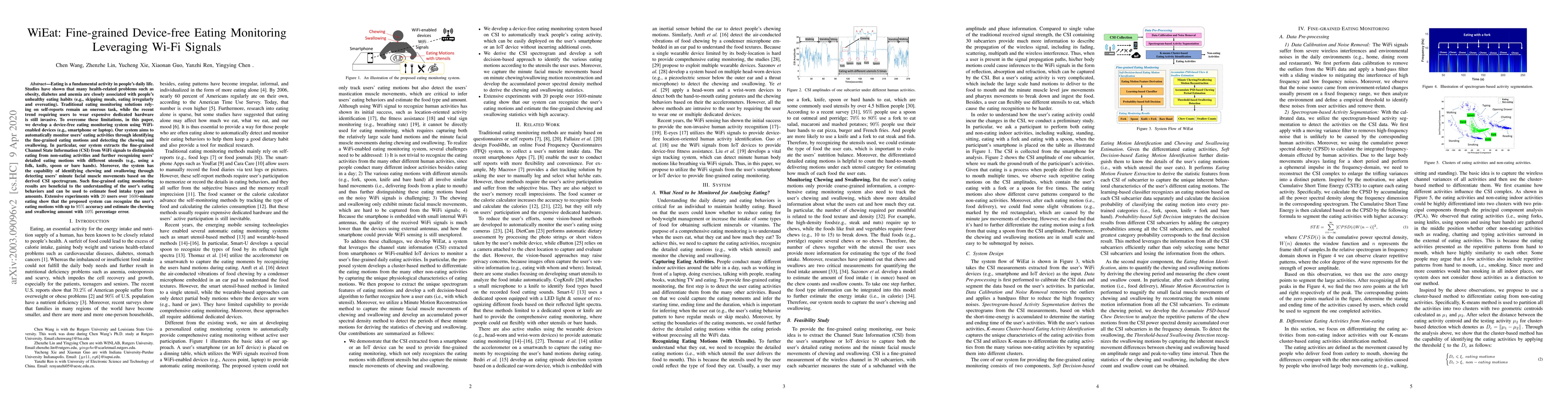 Researchers developed a device-free eating monitoring system using WiFi signals to track users' fine-grained eating motions and detect chewing and swallowing with high accuracy.