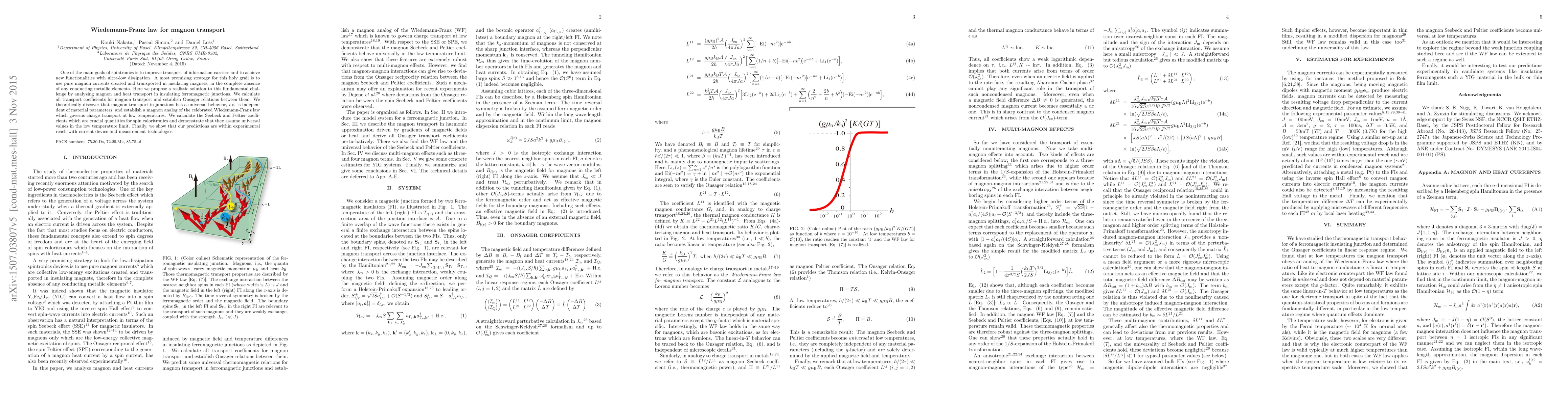 One of the main goals of spintronics is to improve transport of information carriers and to achieve new functionalities with ultra-low dissipation. A most promising strategy for this holy grail is to use pure magnon currents created and transported in insulating magnets, in the complete absence of any conducting metallic elements. Here we propose a realistic solution to this fundamental challenge by analyzing magnon and heat transport in insulating ferromagnetic junctions. We calculate all transport coefficients for magnon transport and establish Onsager relations between them. We theoretically discover that magnon transport in junctions has a universal behavior, i.e. is independent of material parameters, and establish a magnon analog of the celebrated Wiedemann-Franz law which governs charge transport at low temperatures. We calculate the Seebeck and Peltier coefficients which are crucial quantities for spin caloritronics and demonstrate that they assume universal values in the low temperature limit. Finally, we show that our predictions are within experimental reach with current device and measurement technologies.